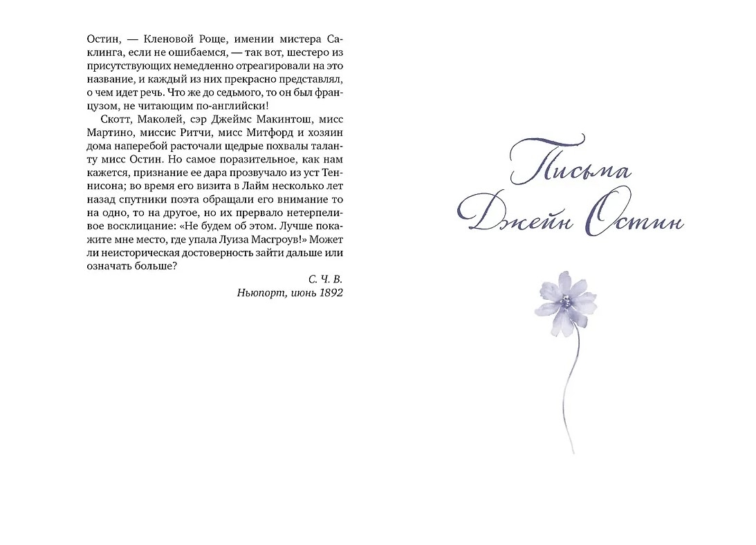 Переписка Джейн с родными и близкими — настоящий подарок для любителей творчества писательницы: в обсуждении повседневных дел мисс Остин присущи наблюдательность и несравненный юмор, которыми славятся ее произведения. Принято считать, что один из любимых адресатов писательницы — преданная сестра Кассандра уничтожила часть ее писем, которые сочла слишком личными и неподходящими для посторонних глаз. Тем ценнее дошедшие до нас фрагменты этой переписки, служившей Джейн Остин окном в мир и источником вдохновения, увлекательной, очаровательной и искристо-остроумной, словно еще один, неопубликованный роман.