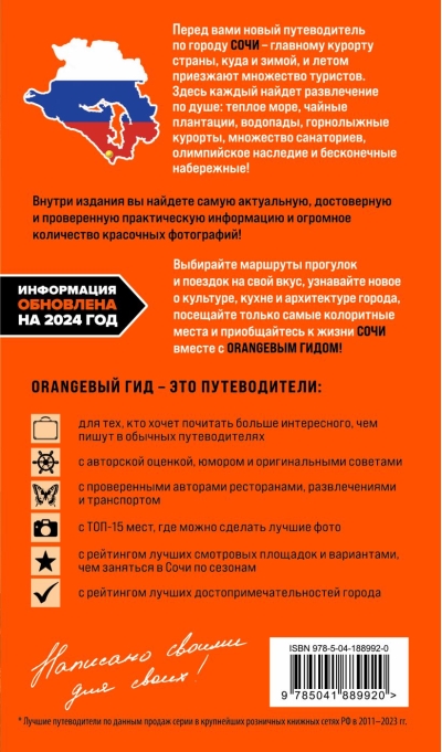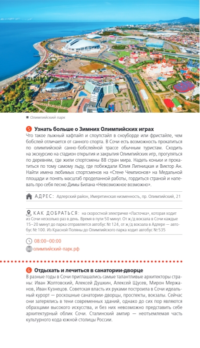 В нем содержится актуальная и полезная информация о Сочи, различные маршруты на любой вкус, подсказки, что делать, если идет дождь, или где искать лучшие смотровые площадки, а также множество полезных советов от автора Ирины Сущевой, которая является местным гидом и блогером. Сориентироваться на местности помогут удобные карты, расположенные на страницах путеводителя.