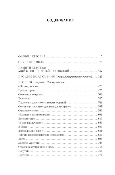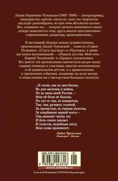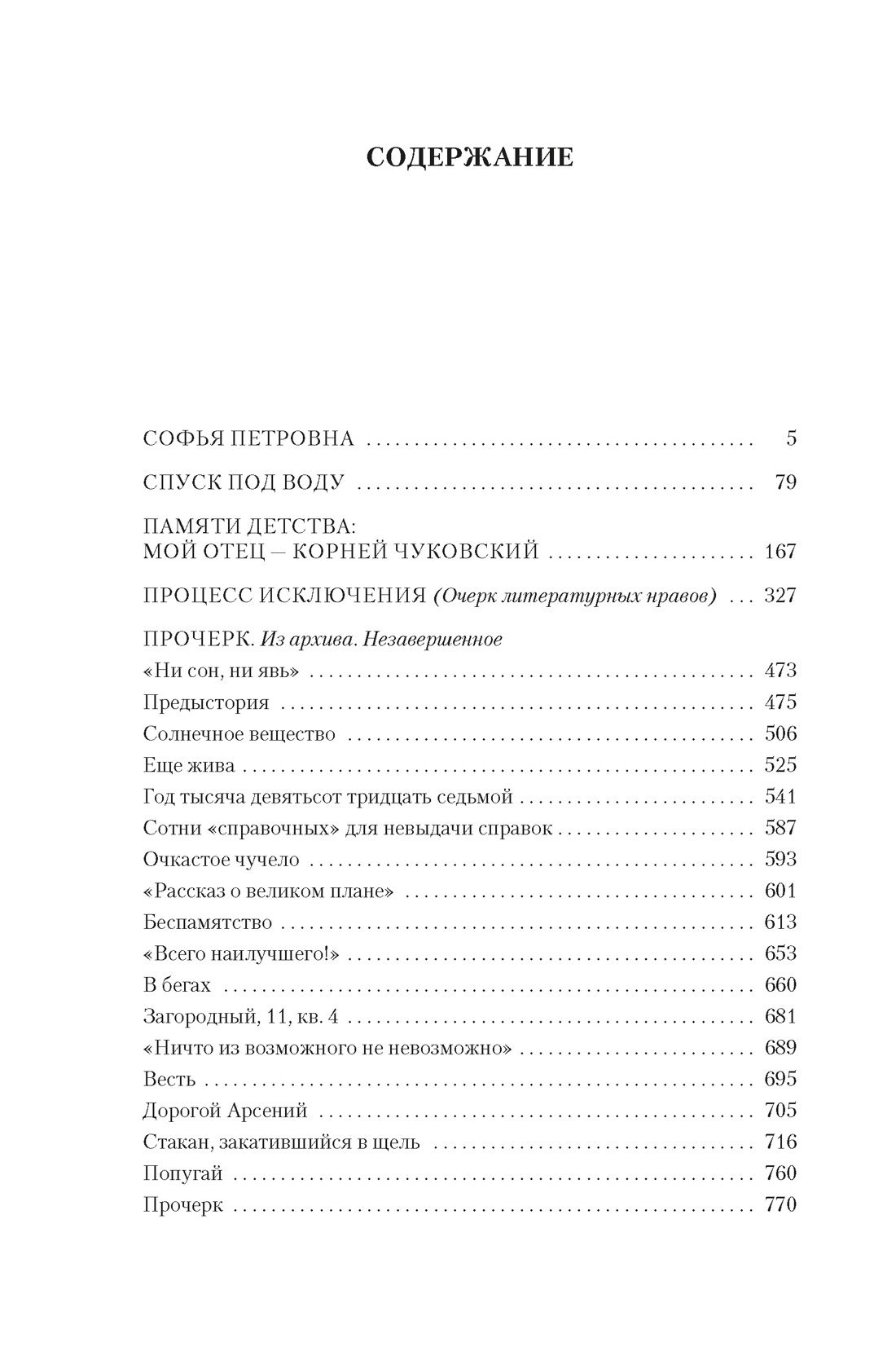 Лидия Корнеевна Чуковская (1907–1996) — литературовед, мемуаристка, критик, писатель, поэт, чье творческое наследие разнообразно, но при этом абсолютно цельно. Все, созданное ею, — отзвуки личного жизненного опыта дочери знаменитого отца, друга многих прославленных современников, редактора, правозащитника. В настоящий сборник вошли художественные произведения Лидии Чуковской — повести «Софья Петровна», «Спуск под воду» и «Прочерк», а также две книги воспоминаний — «Памяти детства: Мой отец — Корней Чуковский» и «Процесс исключения». Все вместе эти произведения запечатлели целую эпоху глазами очевидца и участника, вместив воспоминания и об удивительном детстве, и о драматических и трагических событиях, выпавших на долю автора и осмысленных ею с мастерством большого писателя.