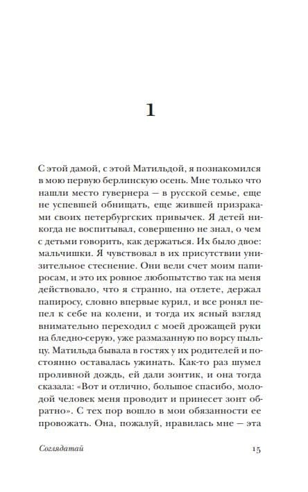 Написанный в Берлине «‎Соглядатай»‎ (1930) — одно из самых загадочных и остроумных русских произведений Владимира Набокова, в котором проявились все основные оригинальные черты зрелого стиля писателя. По одной из возможных трактовок, болезненно самолюбивый герой этого метафизического детектива, оказавшись вне привычного круга вещей и обстоятельств, начинает воспринимать действительность и собственное «‎я»‎ сквозь призму потустороннего опыта. Реальность больше не кажется незыблемой, возможно потому, что «‎все, что за смертью, есть в лучшем случае фальсификация, — как говорит герой набоковского рассказа «‎Terra Incognita»‎, — наспех склеенное подобие жизни, меблированные комнаты небытия»‎.