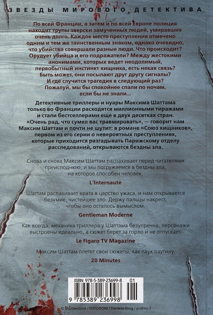 По всей Франции, а затем и по всей Европе полиция находит трупы зверски замученных людей, умиравших очень долго. Каждое место преступления отмечено одним и тем же таинственным знаком, однако очевидно, что убийства совершали разные люди. Что происходит? Орудуют убийца и его подражатели? Между жестокими анонимами, которых ведет неодолимый, первобытный инстинкт хищника, есть некая связь? Быть может, они посылают друг другу сигналы? И где случится трагедия в следующий раз? Пожалуй, мы бы спокойнее спали по ночам, если бы не знали... Детективные триллеры и нуары Максима Шаттама только во Франции расходятся миллионными тиражами и стали бестселлерами еще в двух десятках стран. Поклонники Жан-Кристофа Гранже и Франка Тилье не могут не оценить эти туго закрученные романы, в которых события мчатся во весь опор с первых строк до совершенно ошеломительного финала и никто из героев не отделывается легкими ушибами. «Очень рад, что сумел вас травмировать», — говорит нам Максим Шаттам и почти не шутит: в романе «Союз хищников», первом из его серии о невероятных преступлениях, которые приходится разгадывать Парижскому отделу расследований, открываются бездны зла.