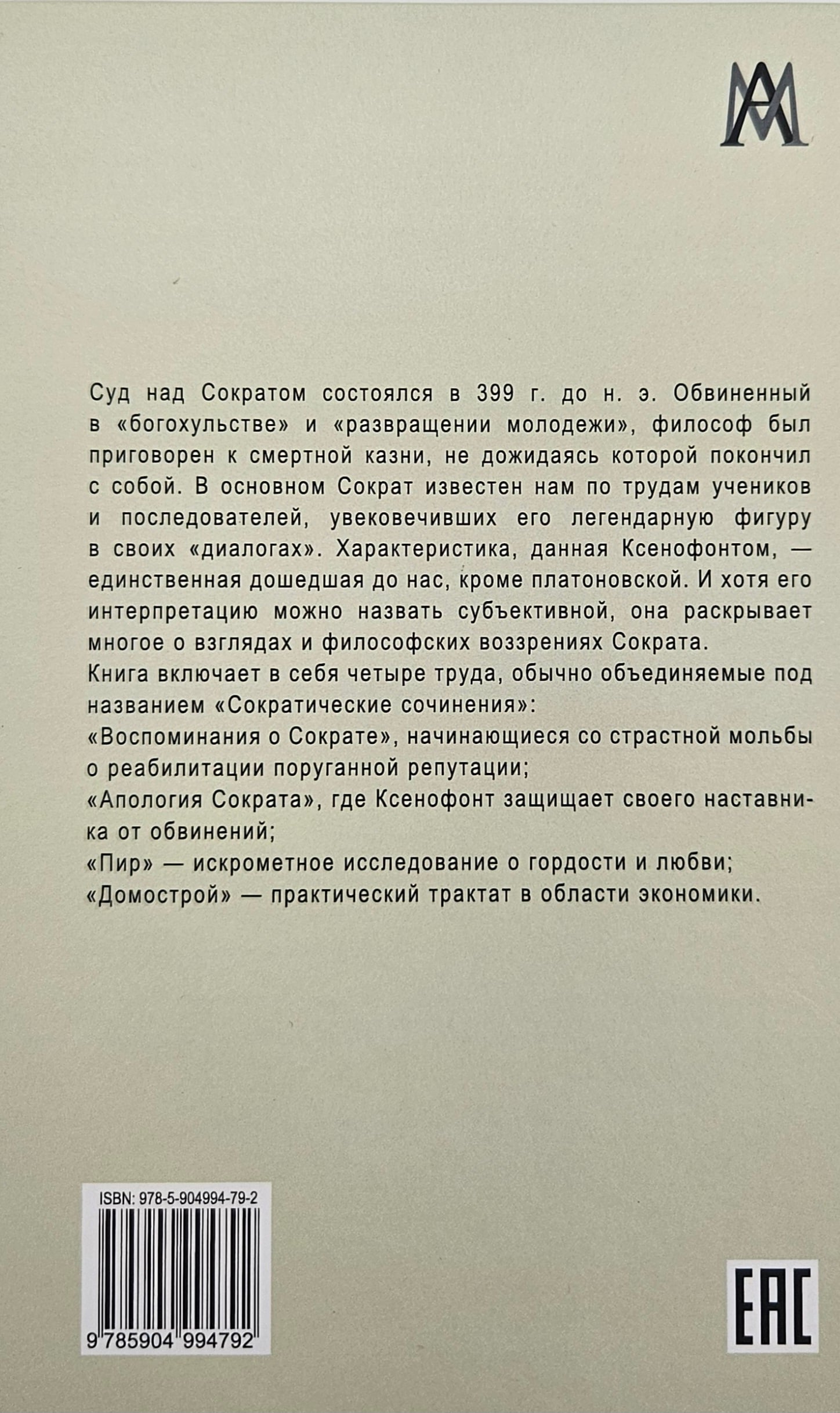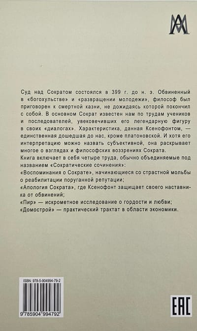 Книга включает в себя четыре труда, обычно объединяемые под названием «Сократические сочинения»: «Воспоминания о Сократе», начинающиеся со страстной мольбы о реабилитации поруганной репутации; «Апология Сократа», где Ксенофонт защищает своего наставника от обвинений; «Пир» — искрометное исследование о гордости и любви; «Домострой» — практический трактат в области экономики. Издание адресовано философам, историкам, а также широкому кругу читателей, интересующихся классическим наследием мировой философской мысли и историей повседневной жизни Древней Греции.