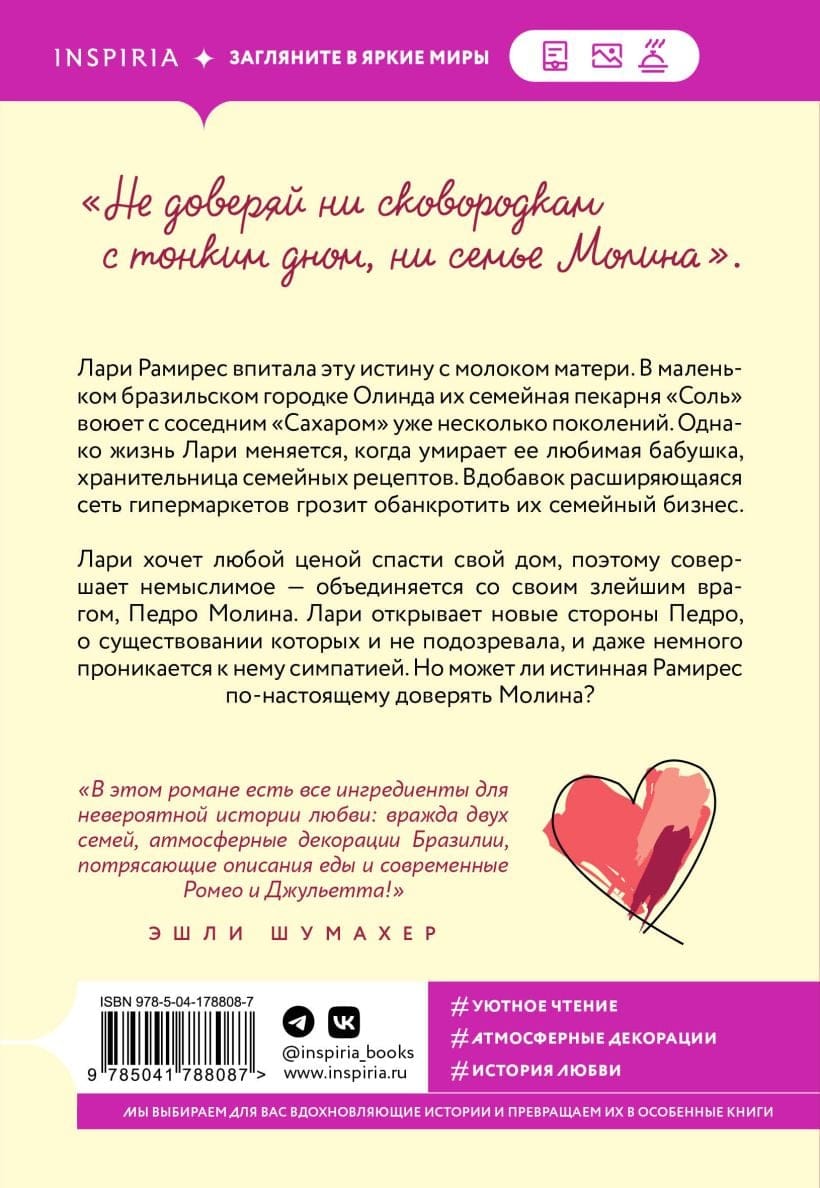 Лари Рамирес впитала эту истину с молоком матери. В маленьком бразильском городке Олинда их семейная пекарня «Соль» воюет с соседним «Сахаром» уже несколько поколений. Однако жизнь Лари меняется, когда умирает ее любимая бабушка, хранительница семейных рецептов. Вдобавок расширяющаяся сеть гипермаркетов грозит обанкротить их семейный бизнес. Лари хочет любой ценой спасти свой дом, поэтому совершает немыслимое — объединяется со своим злейшим врагом, Педро Молина. Лари открывает новые стороны Педро, о существовании которых и не подозревала, и даже немного проникается к нему симпатией. Но может ли истинная Рамирес по-настоящему доверять Молина?