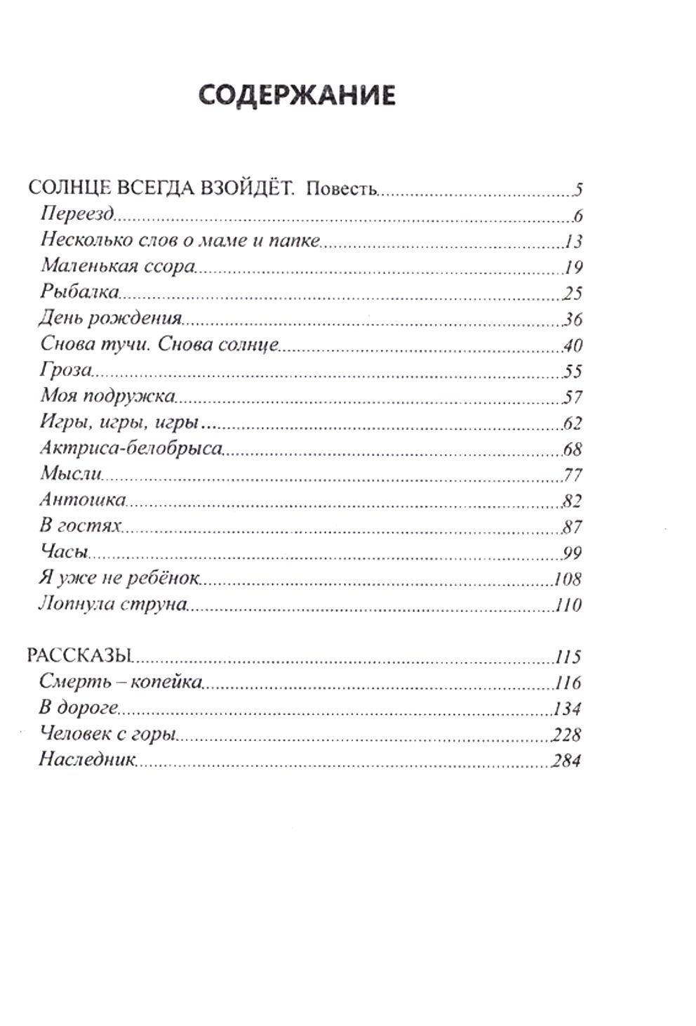 В сборник также вошли рассказы «Смерть – копейка», «В дороге», «Человек с горы», «Наследник». Непохожих друг на друга героев, совершенно различные сюжеты и обстоятельства объединяет в этих рассказах жизнеутверждающее начало и ответы на самые сложные вопросы человеческого бытия.