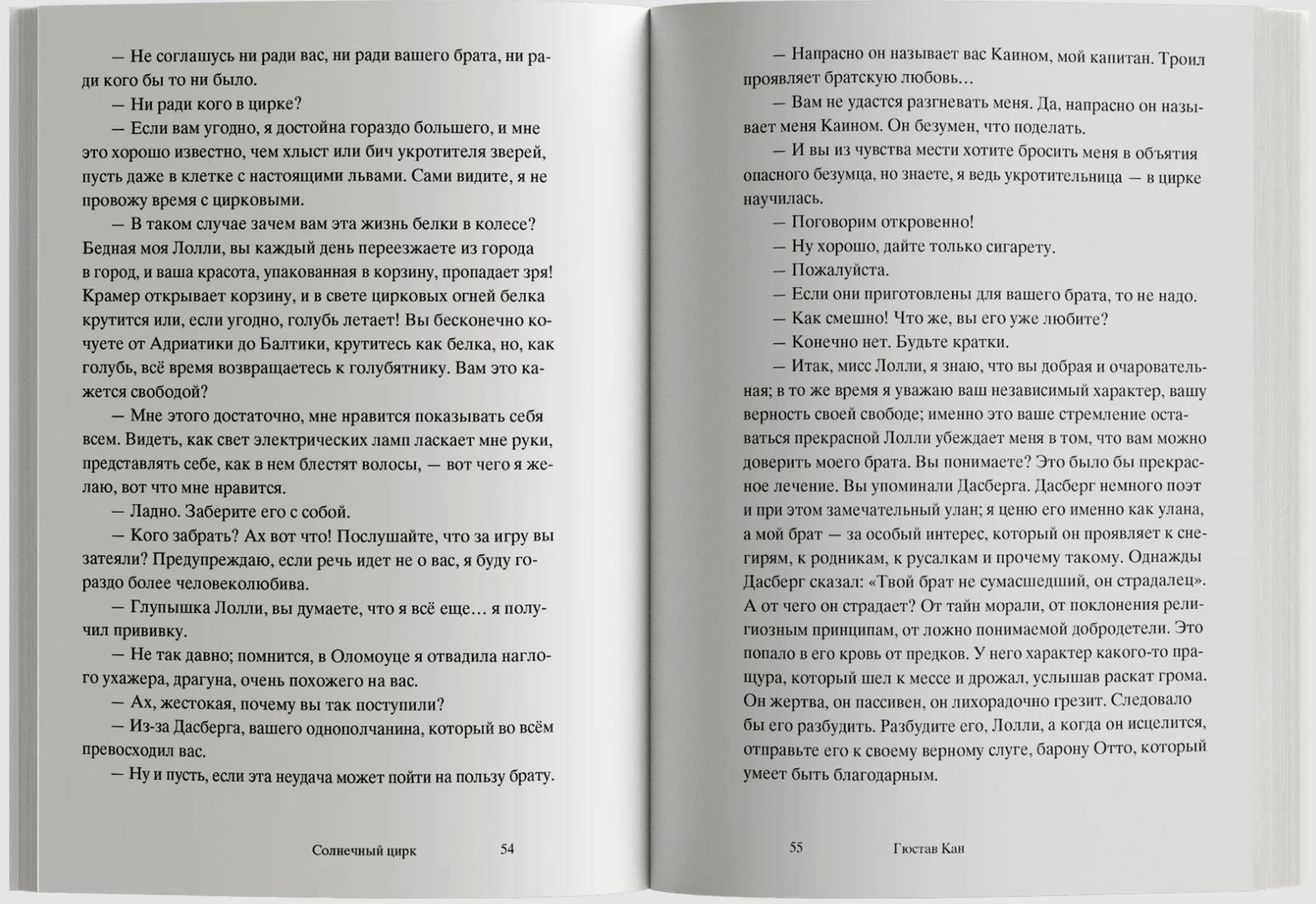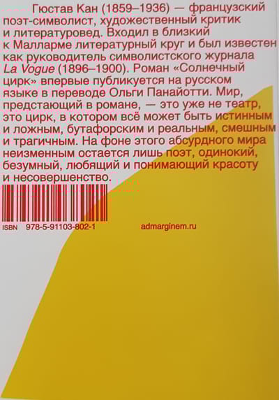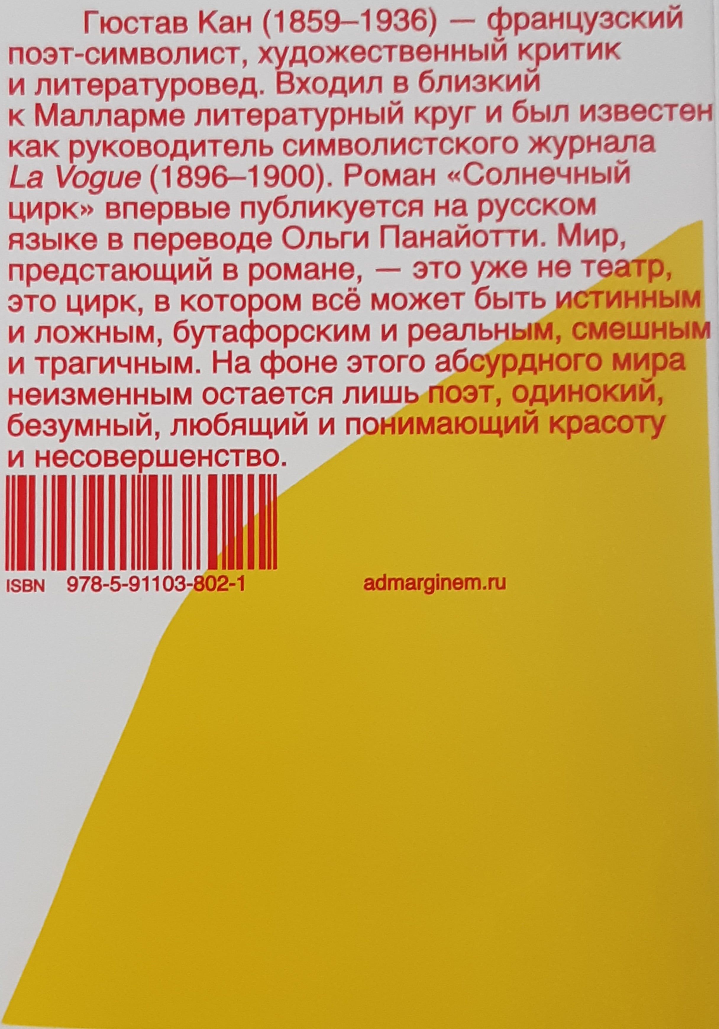 Роман Гюстава Кана «Солнечный цирк» (1899) — потерянная жемчужина французского символизма. Златовласая Лорелея из стихотворения Генриха Гейне устала сидеть на скале, о которую разбиваются лодки очарованных ею моряков, и отправилась покорять города в образе звезды бродячего цирка. Она странствует по городам Европы в сопровождении свиты из рыцарей в доспехах, сарацинов на арабских скакунах, прекрасных итальянок и резвых андалусок, львов и тигров. А зовут ее теперь солнечная принцесса! В небольшом городе она встречает меланхоличного богемского графа, которого семейный совет хочет лишить наследства в пользу младшего брата, бойкого офицера драгунского полка. Солнечная принцесса пробуждает Франца от многолетнего сна, он покидает родной замок и отправляется странствовать с бродячим цирком.