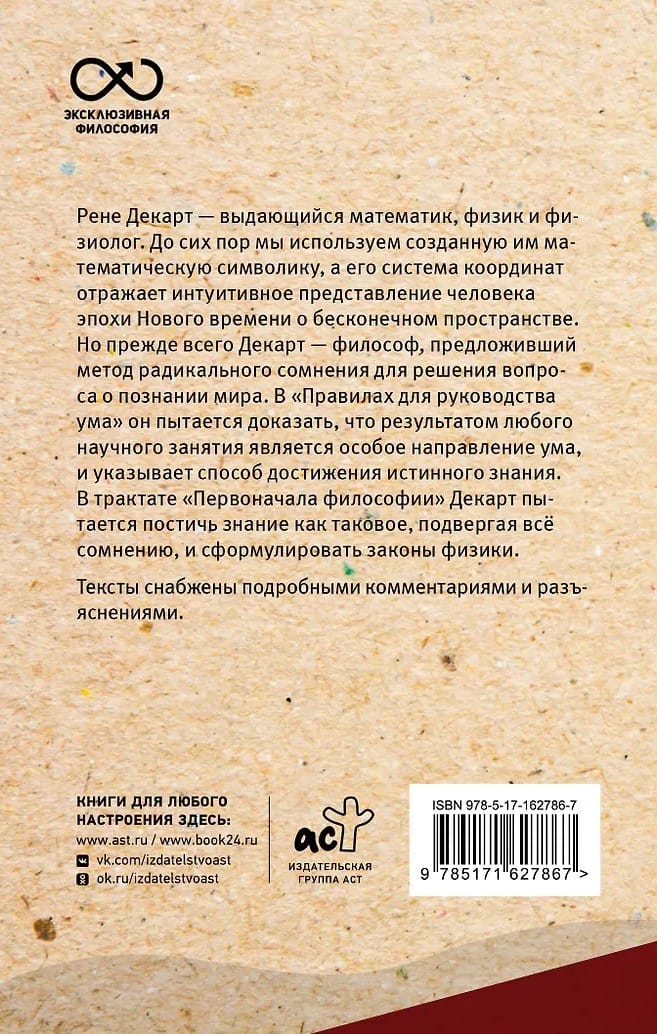 Рене Декарт — выдающийся математик, физик и физиолог. До сих пор мы используем созданную им математическую символику, а его система координат отражает интуитивное представление человека эпохи Нового времени о бесконечном пространстве. Но прежде всего Декарт — философ, предложивший метод радикального сомнения для решения вопроса о познании мира. В «Правилах для руководства ума» он пытается доказать, что результатом любого научного занятия является особое направление ума, и указывает способ достижения истинного знания. В трактате «Первоначала философии» Декарт пытается постичь знание как таковое, подвергая всё сомнению, и сформулировать законы физики. Тексты снабжены подробными комментариями и разъяснениями.