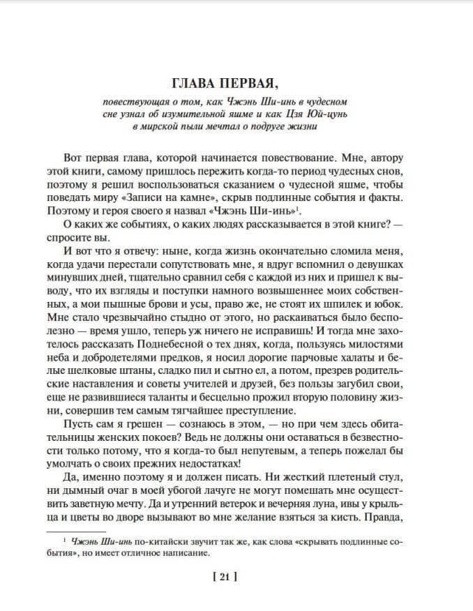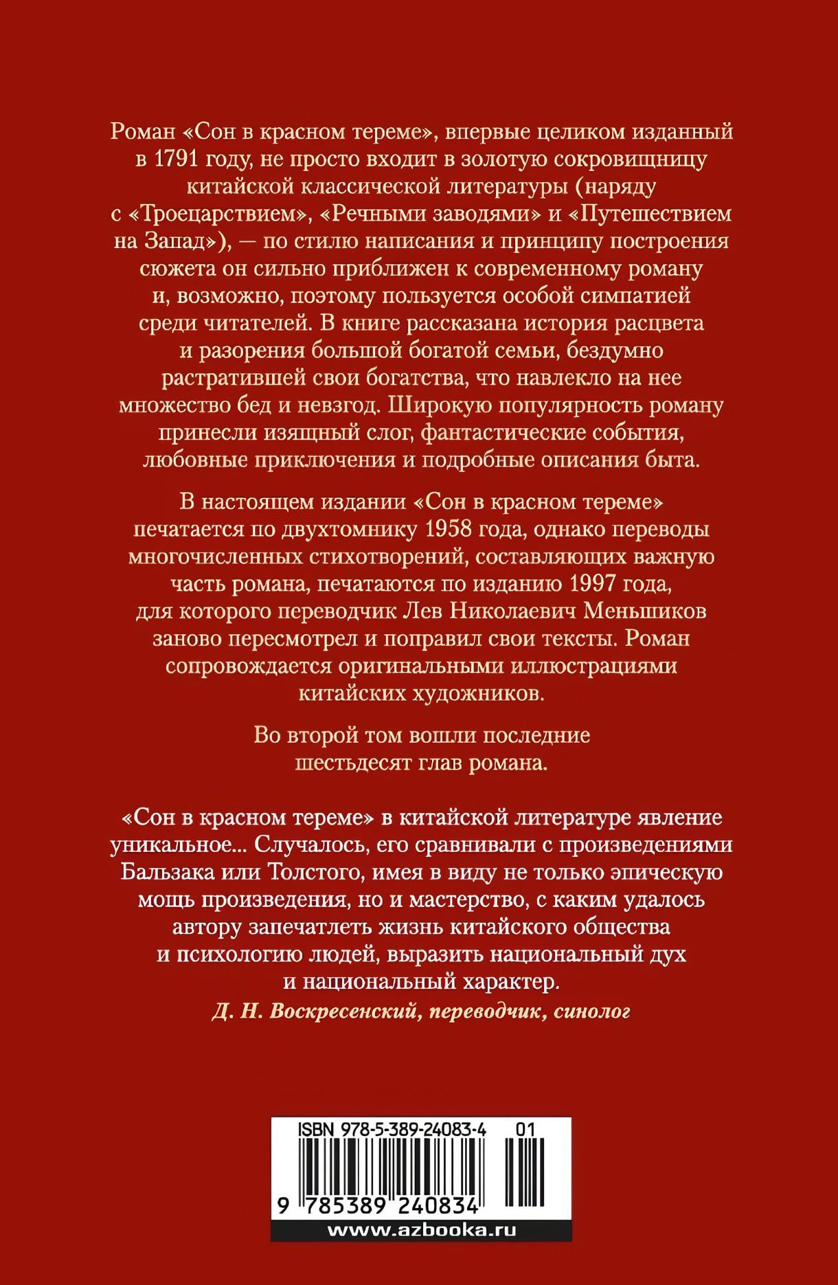 Роман «Сон в красном тереме», впервые целиком изданный в 1791 году, не просто входит в золотую сокровищницу китайской классической литературы (наряду с «Троецарствием», «Речными заводями» и «Путешествием на Запад»), — по стилю написания и принципу построения сюжета он сильно приближен к современному роману и, возможно, поэтому пользуется особой симпатией среди читателей.