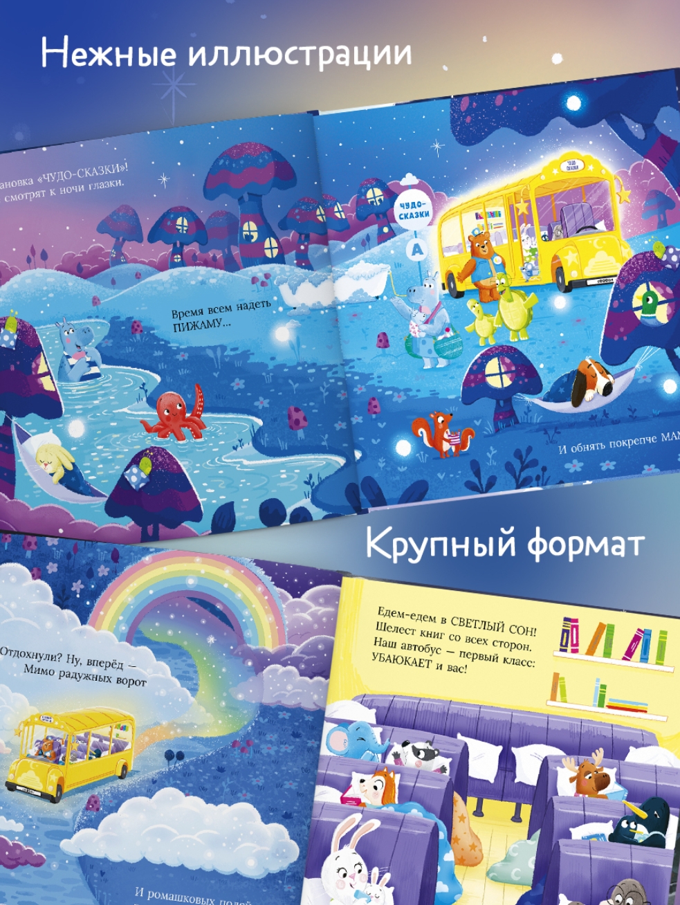 Вместе с пассажирами этого необычного автобуса вы побываете на станциях «Ванный пляж», «Чудо-сказки» и «Светлый сон», а конечная в этом увлекательном путешествии — теплая и уютная кроватка. Волшебные, нежные иллюстрации, убаюкивающие стихи — то, что нужно для спокойного засыпания.