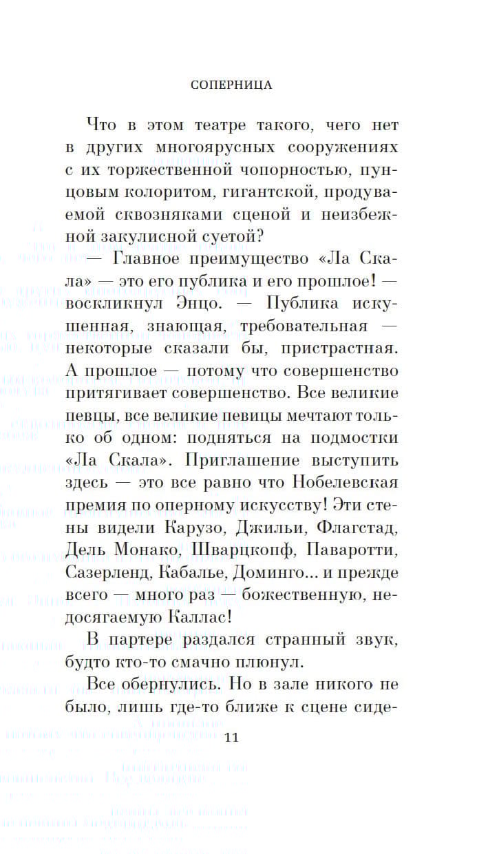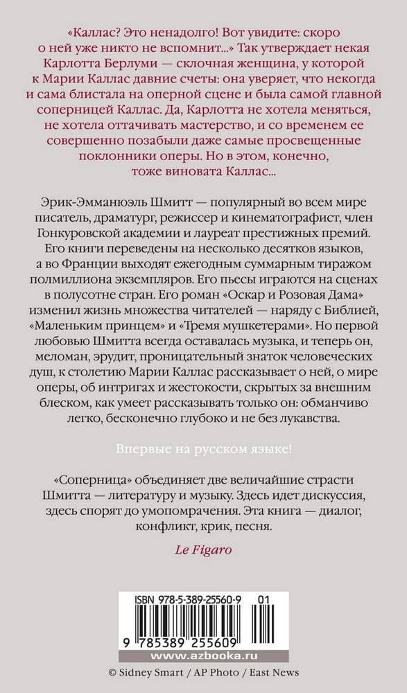 Однако «Соперница» — совсем другая история: миф наизнанку, взгляд из зазеркалья, антипортрет глазами женщины, которая Марию Каллас ненавидит, и эту историю о ней, о мире оперы, об интригах и жестокости, скрытых за внешним блеском, Шмитт рассказывает, как умеет только он: обманчиво легко, бесконечно глубоко и не без лукавства.