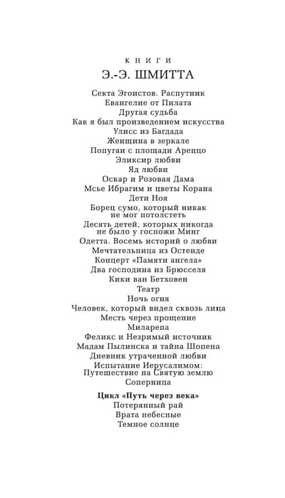 Эрик-Эмманюэль Шмитт — популярный во всем мире писатель, драматург, режиссер и кинематографист, член Гонкуровской академии и лауреат престижных премий. Его книги переведены на несколько десятков языков, а во Франции выходят ежегодным суммарным тиражом полмиллиона экземпляров, его пьесы играются на сцене в полусотне стран. Его роман «Оскар и Розовая Дама» изменил жизнь множества читателей — наряду с Библией, «Маленьким принцем» и «Тремя мушкетерами».