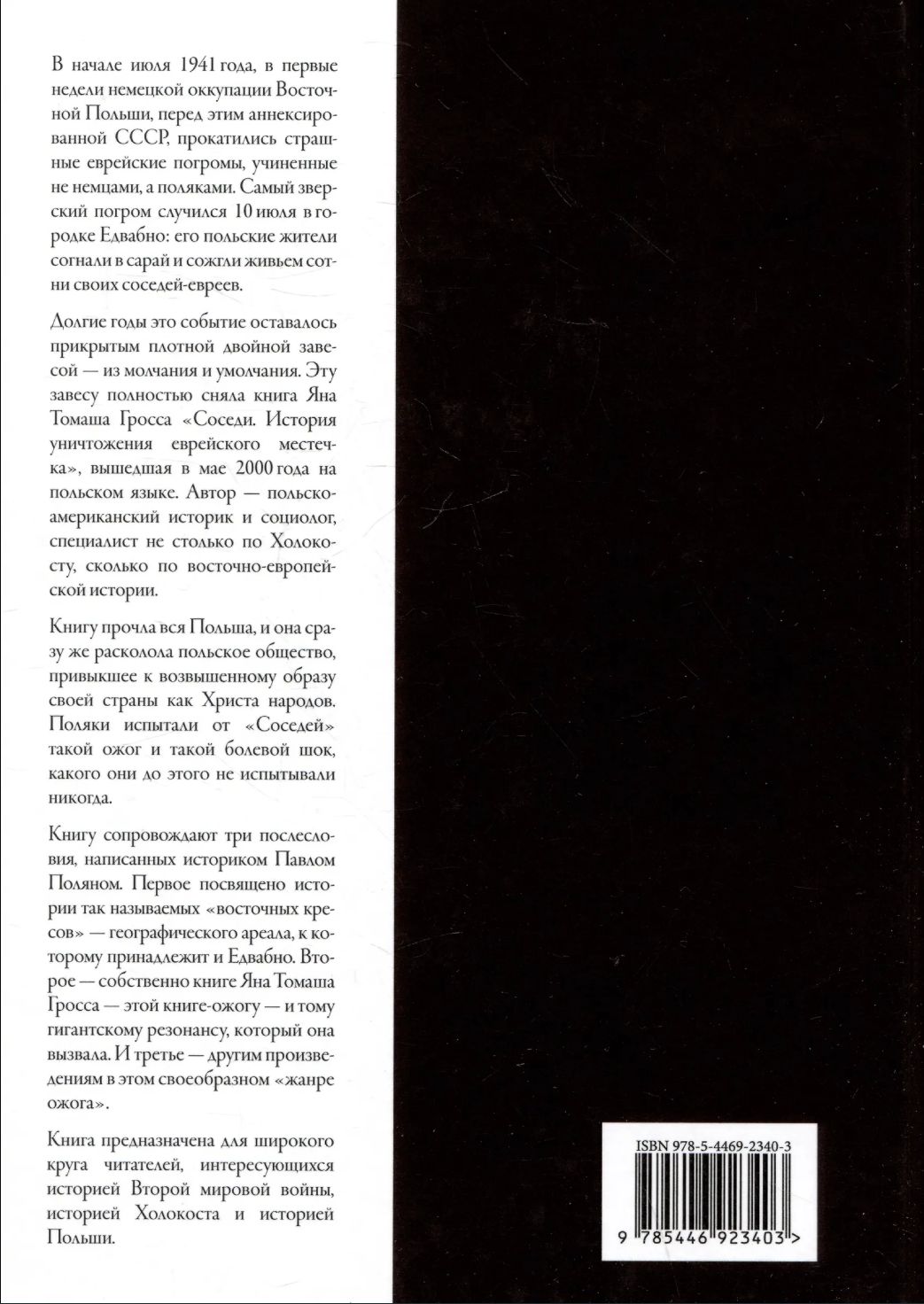 В начале июля 1941 года, в первые недели немецкой оккупации Восточной Польши, прокатились страшные еврейские погромы, учиненные не немцами, а поляками. Самый зверский погром случился 10 июля в городке Едвабно: его польские жители согнали в сарай и сожгли живьем сотни своих соседей-евреев. Долгие годы это событие оставалось прикрытым плотной двойной завесой — из молчания и умолчания. Эту завесу полностью сняла книга Яна Томаша Гросса «Соседи. История уничтожения еврейского местечка», вышедшая в мае 2000 года на польском языке.