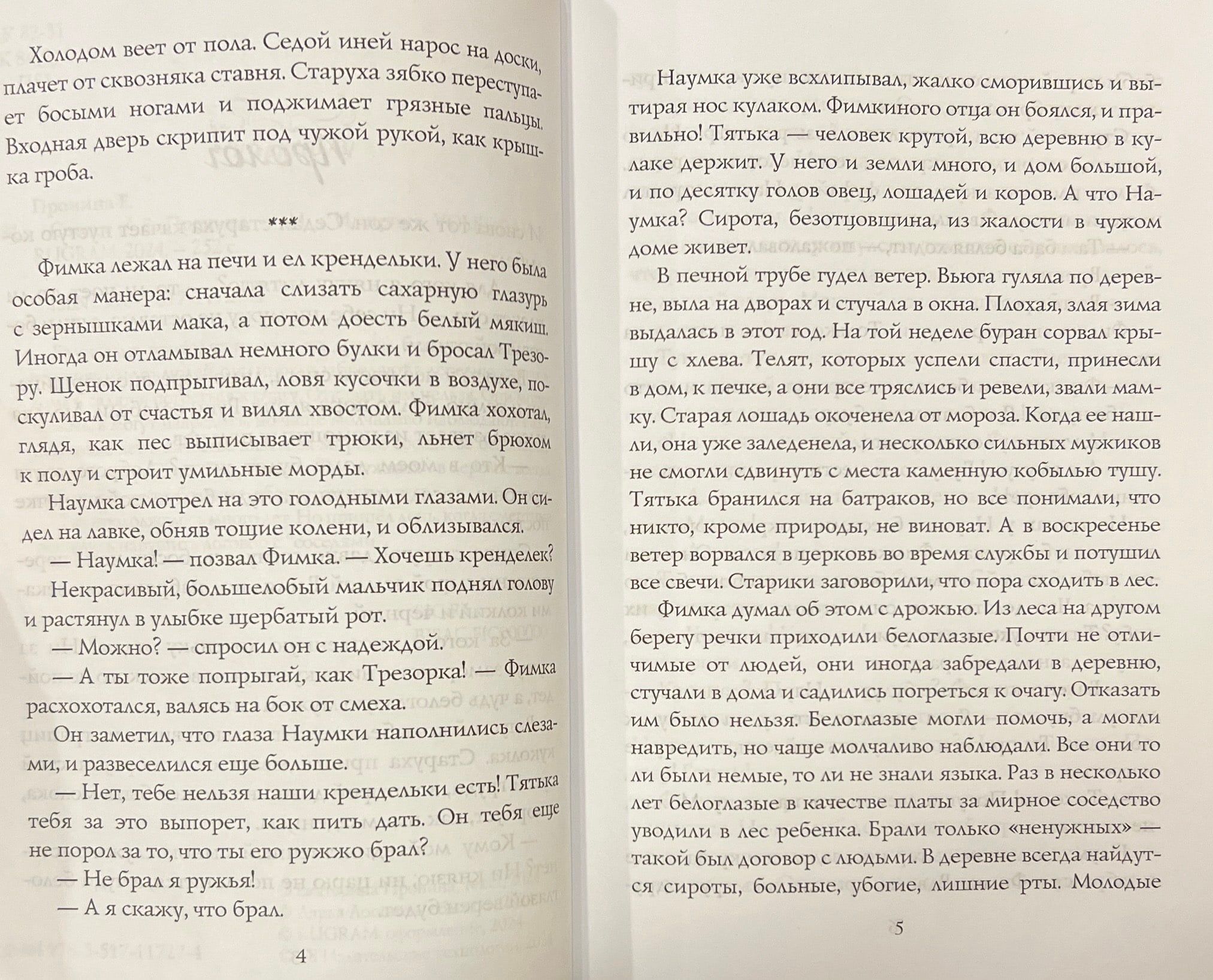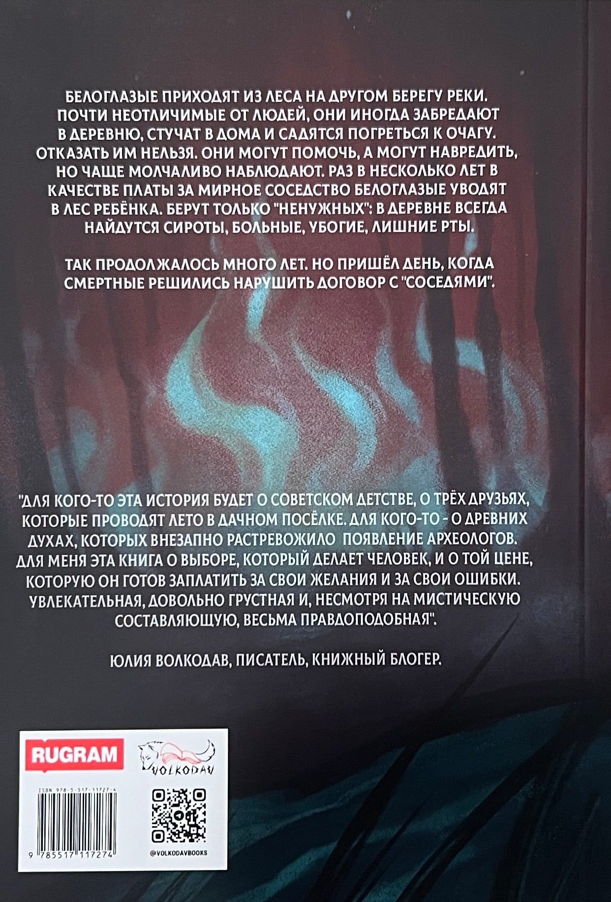 Белоглазые приходят из леса на другом берегу реки. Почти неотличимые от людей, они иногда забредают в деревню, стучат в дома и садятся погреться к очагу. Отказать им нельзя. Они могут помочь, а могут навредить, но чаще молчаливо наблюдают. Раз в несколько лет в качестве платы за мирное соседство белоглазые уводят в лес ребёнка. Берут только «‎ненужных»‎: в деревне всегда найдутся сироты, больные, убогие, лишние рты.Так продолжалось много лет. Но пришёл день, когда смертные решились нарушить договор с «‎соседями»‎.