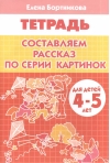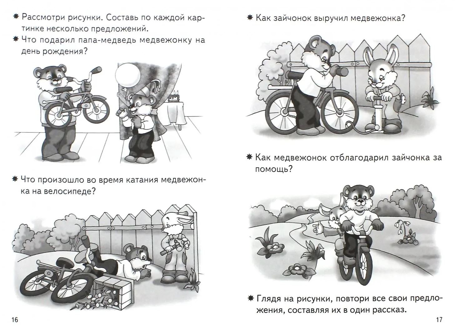 Уважаемые родители и педагоги. Предлагаем вашему вниманию задания на развитие связной речи и творческого воображения у детей 4—5 лет. Первоначальный этап развития связной речи — составление одного предложения по картинке. Только убедившись, что ребенок научился составлять грамматически правильное сложное предложение по картинке, используя наводящие вопросы взрослого, предложите ему новый этап работы — составление рассказа по серии картинок. Тетрадь рассчитана на совместную работу взрослых и детей. Адресована родителям и педагогам для занятий с дошкольниками. Желаем успеха вашему ребенку.