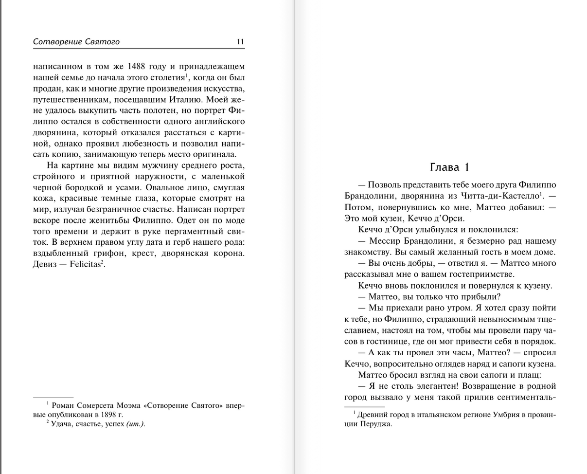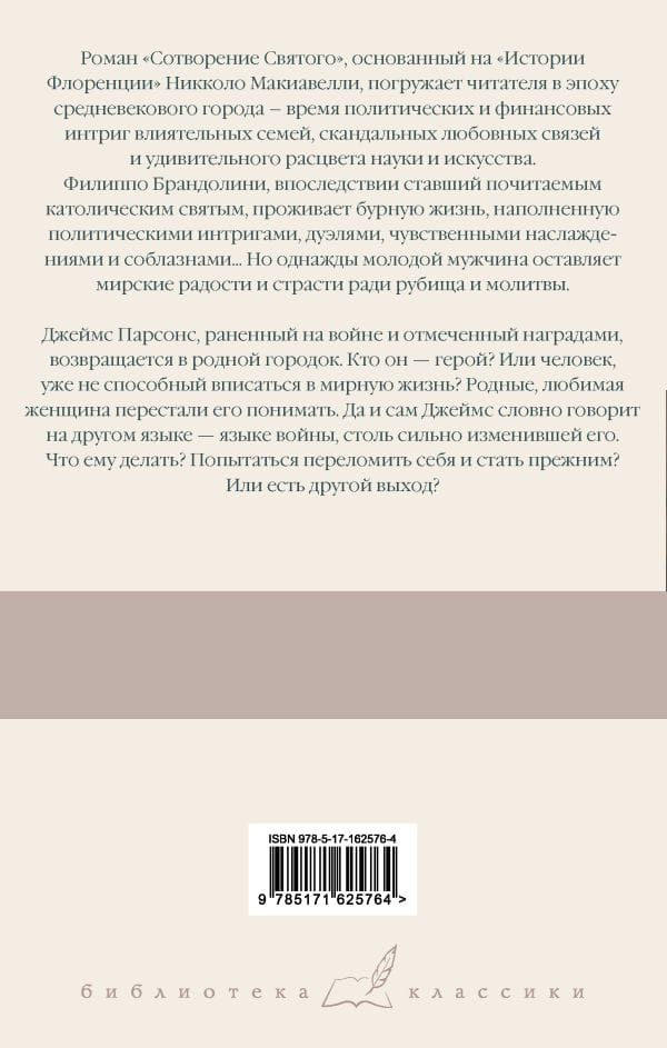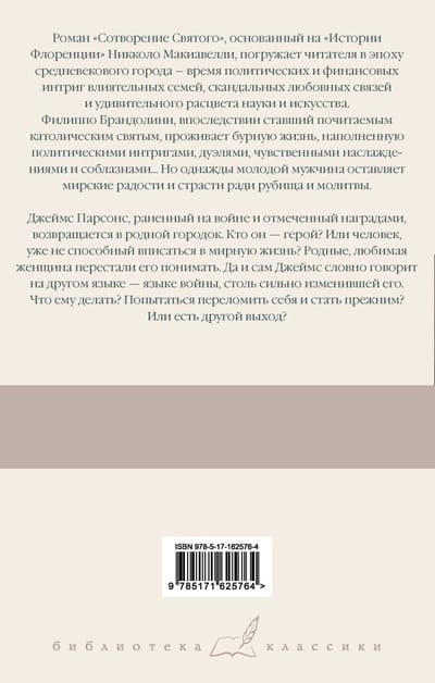 Роман «Сотворение Святого», основанный на «Истории Флоренции» Никколо Макиавелли, погружает читателя в эпоху средневекового города – время политических и финансовых интриг влиятельных семей, скандальных любовных связей и удивительного расцвета науки и искусства.