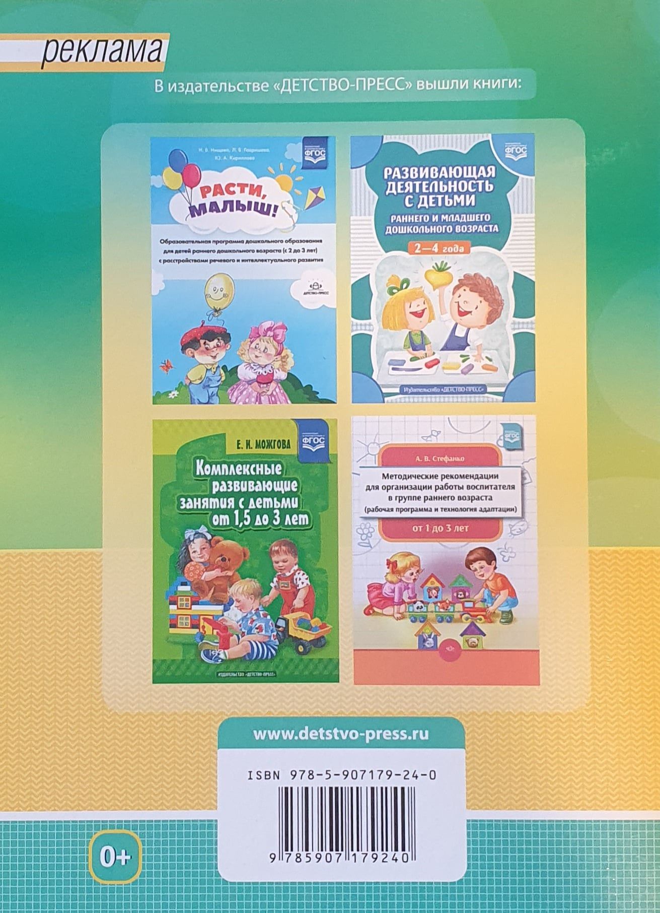 В книге представлена программа развивающих занятий детей второго года жизни и их родителей под руководством специалиста, которая является частью программного комплекса «Растем вместе» (победитель II Всероссийского конкурса психолого-педагогических программ «Новые технологии для новой школы») и направлена на развитие эмоциональных отношений между матерью, отцом и ребенком раннего возраста, а также оказание помощи родителям в процессе воспитания и развития ребенка. В конспектах занятий с детьми раннего возраста представлены коммуникативные, психогимнастические, телесно ориентированные игры и упражнения, игровые массажи, физкультурно-оздоровительные и арт-терапевтические упражнения, арт-педагогические задания, упражнения с дидактическим материалом, театрализации сказок. Программа «Дитятко» уже более 17 лет реализуется в дошкольных учреждениях и центрах раннего развития нашей страны и за рубежом.