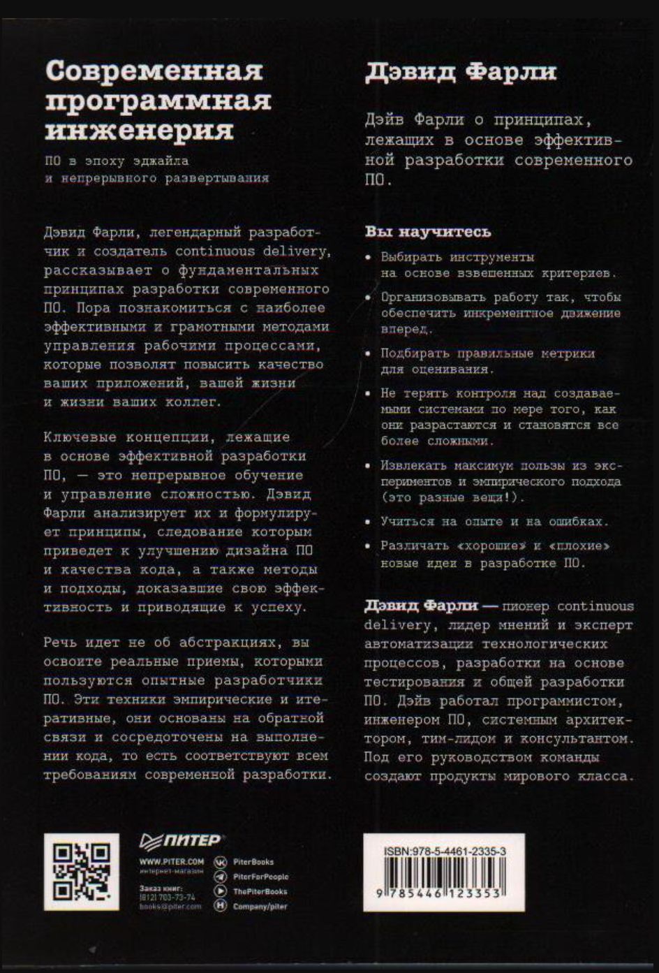 Дэвид Фарли, легендарный разработчик и создатель continuous delivery, рассказывает о фундаментальных принципах разработки современного ПО. Пора познакомиться с наиболее эффективными и грамотными методами управления рабочими процессами, которые позволят повысить качество ваших приложений, вашей жизни и жизни ваших коллег.