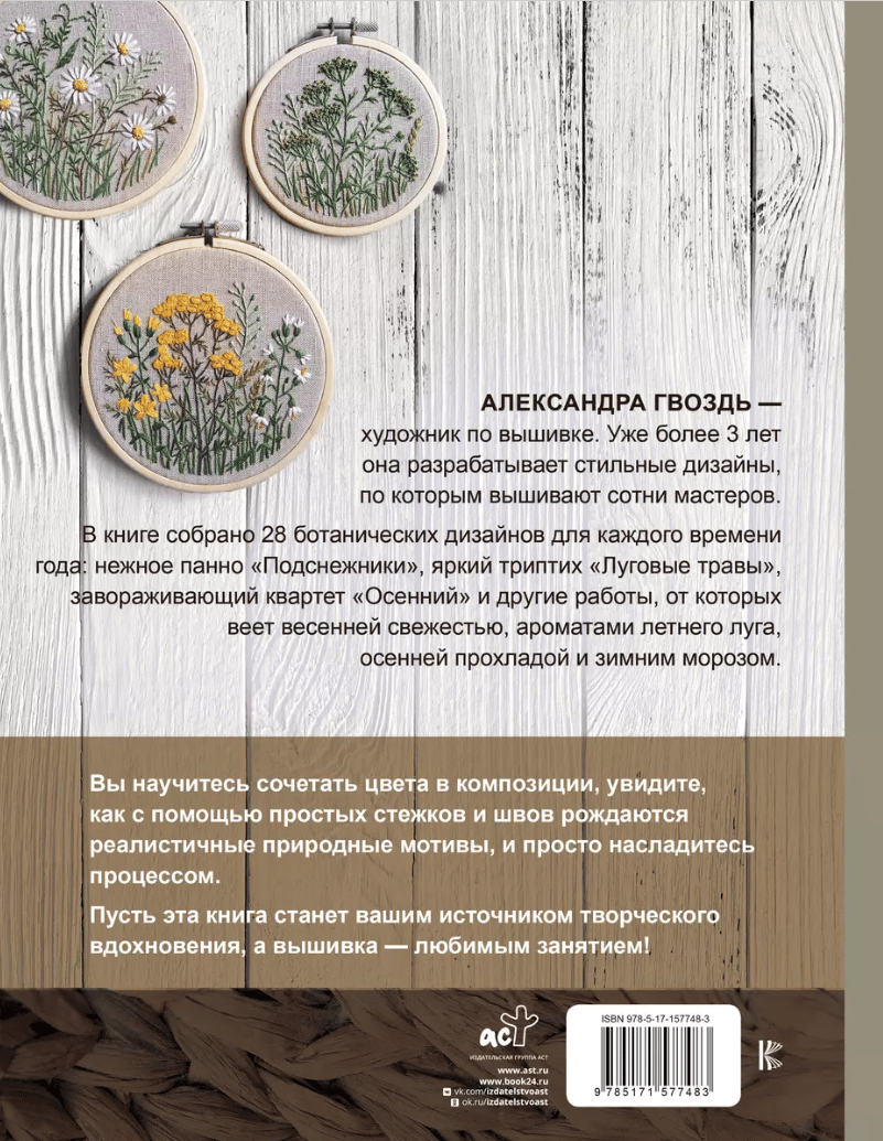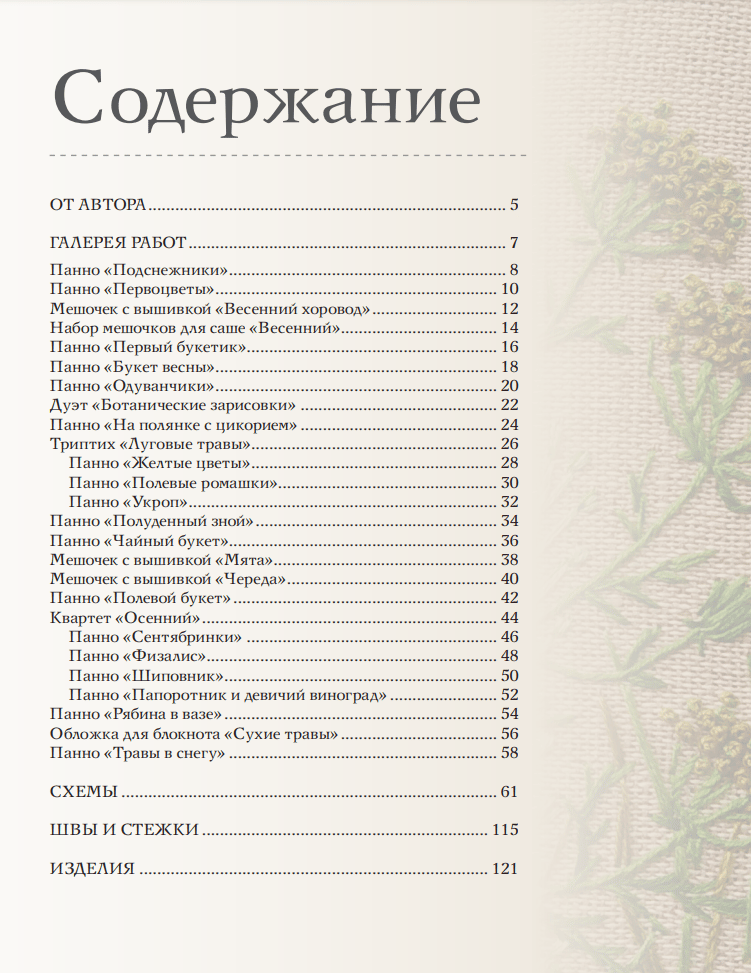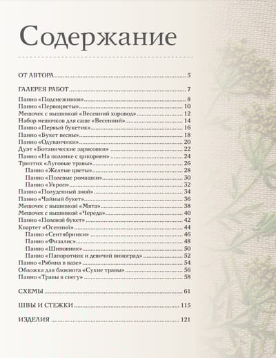 В книге собрано 28 ботанических дизайнов для каждого времени года: нежное панно «Подснежники», яркий триптих «Луговые травы», завораживающий квартет «Осенний» и другие работы, от которых веет весенней свежестью, ароматами летнего луга, осенней прохладой и зимним морозом.