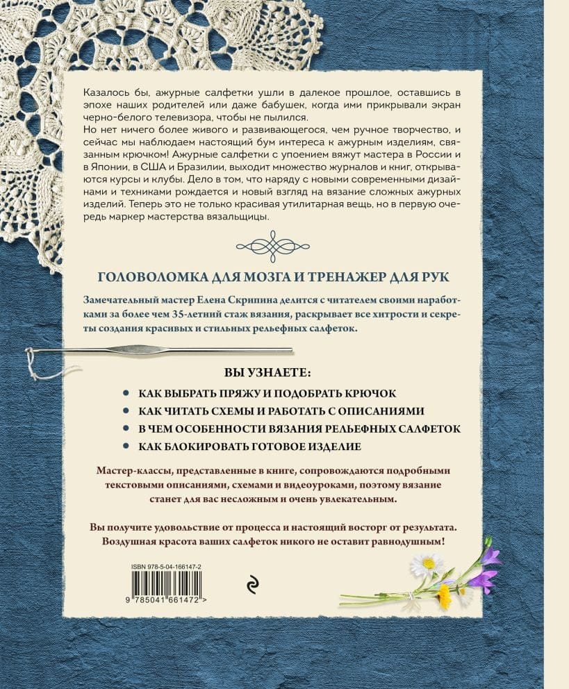 Первое полномасштабное издание, посвященное вязанию рельефных или 3D-салфеток крючком от российского мастера с огромным стажем Елены Скрипиной! Научиться вязать такое ажурное и объемное чудо кажется многим непосильной задачей, но следуя инструкциям из книги и разбирая схемы под чутким руководством автора, вы легко освоите новый для себя вид искусства. А ведь это именно искусство: не только украшение интерьера, но и уникальный способ самовыражения в творчестве! Они могут быть классическими и современными, сложными и не очень, из них можно собрать плед или панно, а может быть, даже абажур, их можно вставить в рамочку и повесить на стену, как картину. Но помимо уникального визуального эффекта, они несут в себе нотку ностальгии по тем временам, когда в любимом доме было уютно и пахло бабушкиными пирогами. Это теплое послевкусие не делает их архаичными, скорее наоборот, привносит индивидуальность в любой, даже самый минималистичный интерьер! Это роскошное хобби развивает внимательность, служит разминкой для рук и тренажером для мозга. Множество курсов и мастер-классов по всему миру, от Японии до Швеции, в некоторых странах даже проводят чемпионаты по вязанию салфеток, и они неизменно собирают сотни зрителей.