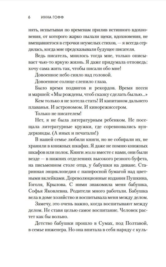 Произведения Инны Гофф очень разные: воспоминания о юности и военном времени, рассказы-исследования о жизни и творчестве писателей, импрессионистические заметки и рассказы-путешествия о поездках в Италию, Карелию, Подмосковье.