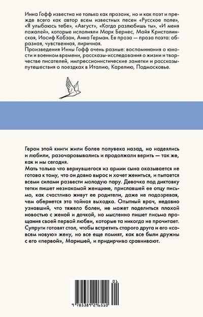 Герои этой книги жили более полувека назад, но надеялись и любили, разочаровывались и продолжали верить — так же, как и мы сегодня. Мать только что вернувшегося из армии сына оказывается не готова к тому, что ее сын давно вырос и хочет жениться, и пытается всеми силами развести молодую пару. Девочка под диктовку тетки пишет незнакомой женщине, приславшей ее отцу письмо, как счастливо живут ее родители, даже не подозревая, чем обернется эта тайная выходка. Опытный врач, недавно узнавший, что тяжело болен, не может поделиться плохой новостью с женой и дочкой, но мысленно пишет письма прощания своей давней любви, которые она никогда не прочтет. Семейная пара готовит стол, чтобы встретить старого друга и его «совсем новую» жену, но всё еще помнит, как все они были дружны с его «первой», Маришей, и придирчиво сравнивают.