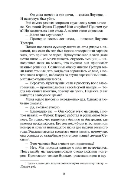Смерть знаменитого писателя Алана Конвея поставила точку в редакторской карьере Сьюзен Райленд. Теперь она управляет отелем на берегу Эгейского моря, однако не слишком успешно — денег катастрофически не хватает. Скучая по лондонской суете, Сьюзен подумывает о том, не сбежать ли из этого райского местечка, и кажется, сама судьба подкидывает ей шанс. Супруги-англичане обращаются к Райленд за помощью, обещая хорошо заплатить. Исчезла их дочь, успев признаться родителям, что на страницах детективного романа Конвея нашла ключ к разгадке кровавого преступления, совершенного восемь лет назад в Суффолке... Редактором этой книжной серии, оказывается, была Сьюзен. Удастся ли ей распутать хитросплетения авторской мысли? Мисс Райленд срочно отправляется в Англию, испытывая настоящий азарт сыщика, и ей не сразу приходит в голову, что нельзя безнаказанно ворошить тайны прошлого. Но это становится очевидным, когда над ней нависает смертельная опасность... Роман в романе, литературная игра, полная загадок и мистификаций!