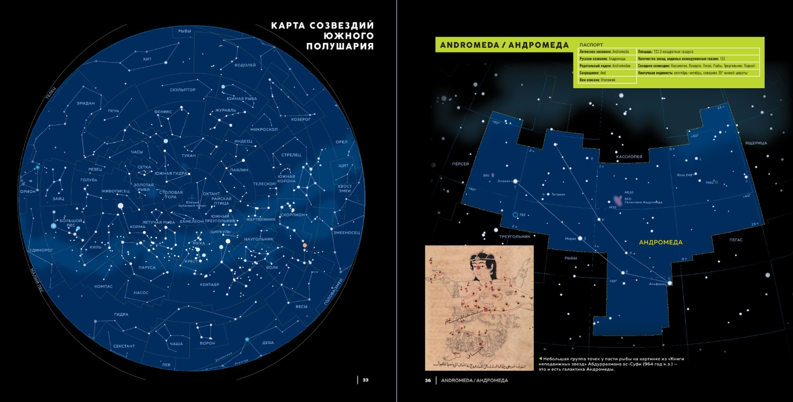Для удобства читателей, для облегчения поиска созвездий на небе на каждое созвездие есть «Паспорт» — описание с его характеристиками. «Паспорта» окрашены тремя цветами. Зеленый — созвездия Северного полушария, желтый — экваториальные созвездия, синий — созвездия Южного полушария.