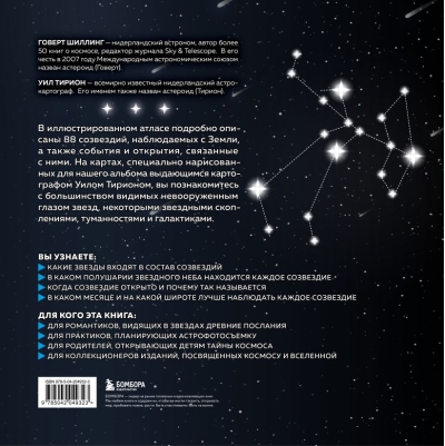 Звёздный гид от легендарных авторов: писателя-астронома Говерта Шиллинга и картографа Уила Тириона — создателя самых точных звёздных карт XX века. Яркие, чёткие иллюстрации и продуманная структура позволяют легко ориентироваться среди 88 созвездий. Лаконичные описания и интересные факты о событиях, происходивших в зоне каждого созвездия, пробуждают истинное любопытство и интерес к исследованию темы космоса.