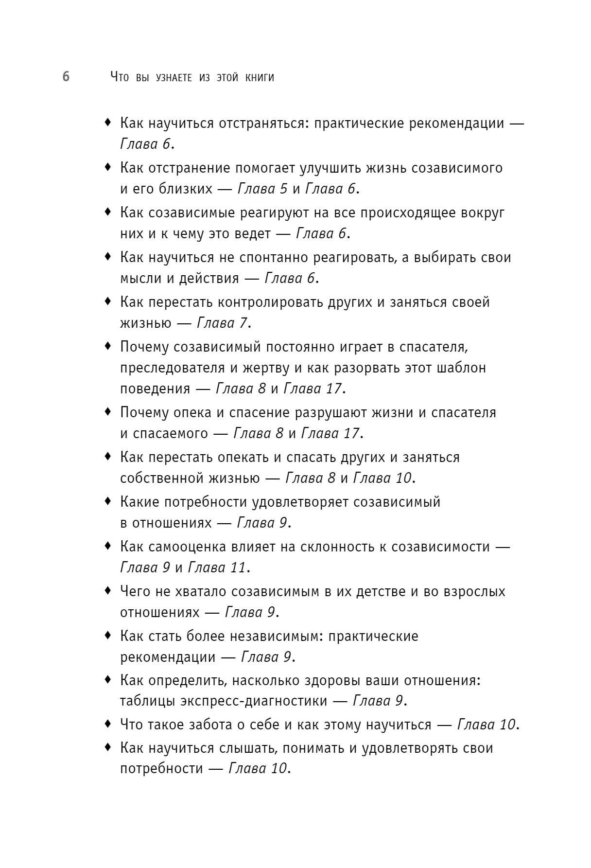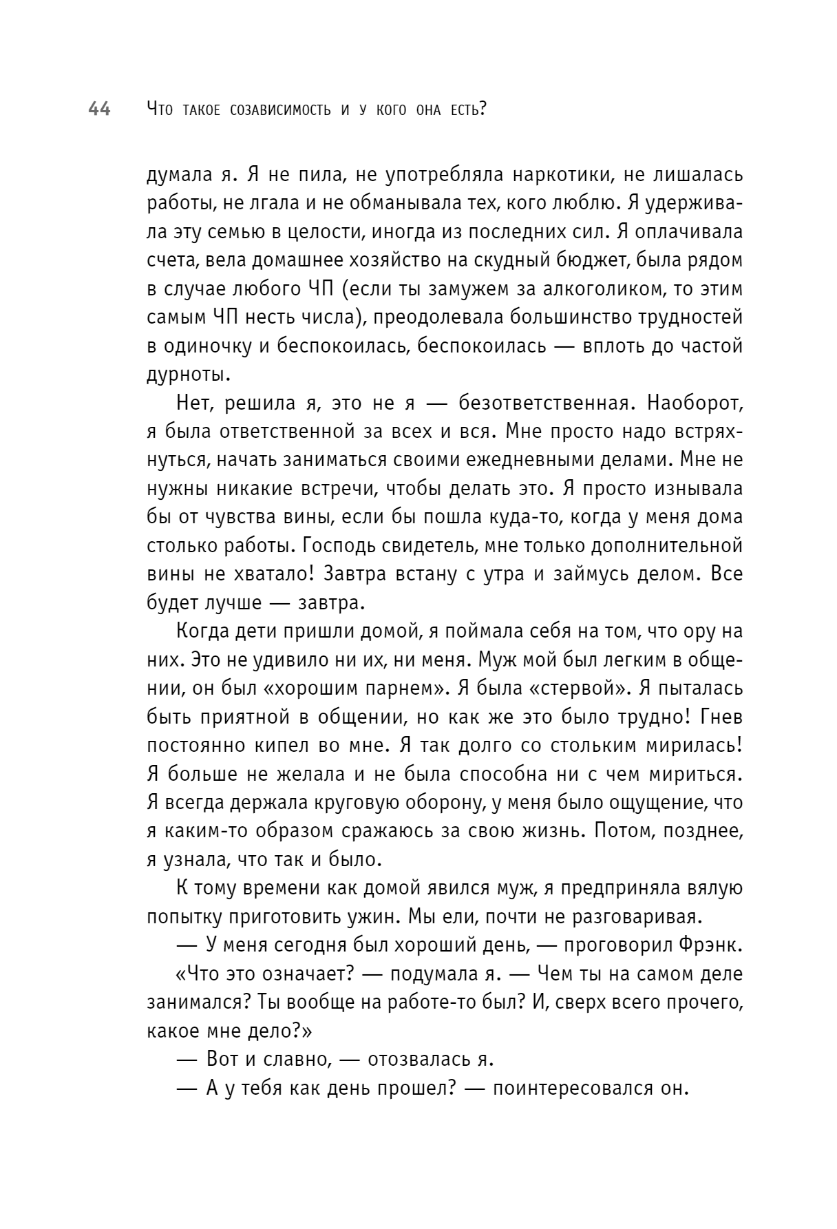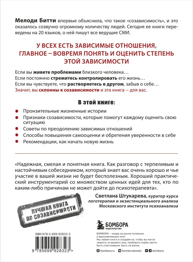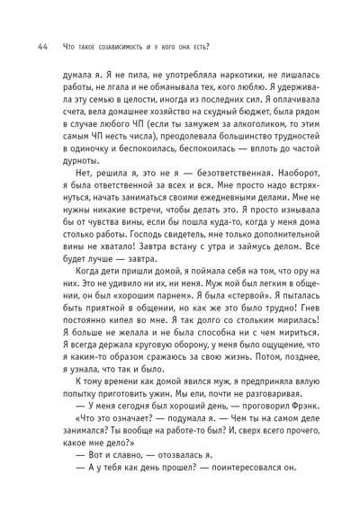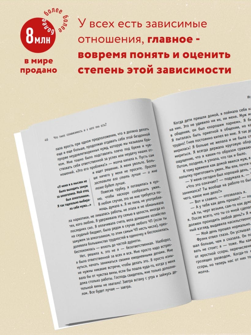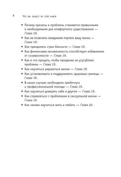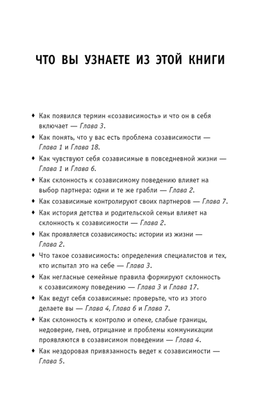 У всех есть зависимые отношения, главное — вовремя понять и оценить степень этой зависимости. Может быть, вы воспринимаете чужие проблемы так же остро, как свои. Или, пусть даже неосознанно, стремитесь контролировать жизнь близкого человека. Не исключено, что собственная жизнь без кого-то кажется вам пустой и бессмысленной. Возможно, вы растворяетесь в другом, забывая о себе. Мелоди Битти называет наше желание без конца опекать и спасать близких болезнью и объясняет, как с этой болезнью справиться, чтобы окончательно не разрушить себя.