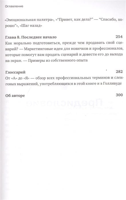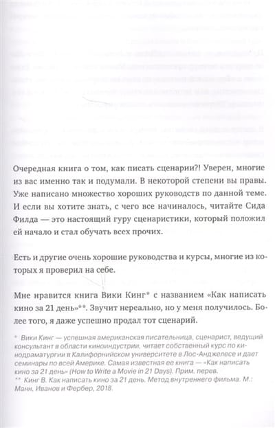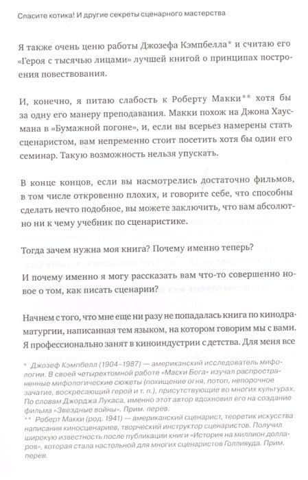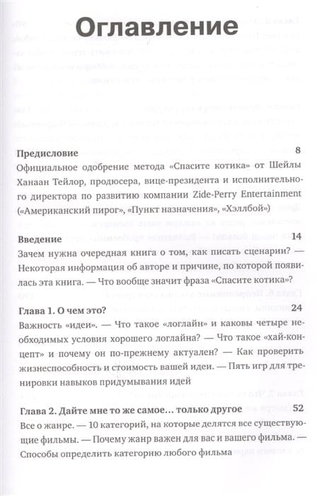 Это пособие о сценарном мастерстве, которое дает ответы на большинство вопросов, возникающих при создании сценария. Автор описывает приемы, которые помогут создать сценарий с хорошим коммерческим потенциалом, яркими героями и запоминающимся названием. Кроме того, известный сценарист делится своими авторскими идеями: классификацией жанров, отличной от общепринятой (в которой фильм всегда принадлежит одному жанру и не бывает боевиков с элементами триллера, драмы и приключений) и Blake Snyder Beat Sheet — структурой сценариев, описывающей большинство успешных картин. А при чем тут кот? Спасение кота — прием, который описывает автор. Если вы хотите вызвать симпатию к своему герою у зрителя, тому стоит совершить какой-нибудь вызывающий одобрение и уважение поступок, например снять котенка с дерева.