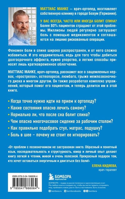При постоянных болях в спине возникает чувство, что прежняя жизнь закончилась. Внезапно приходится привыкать к дискомфорту: каждое движение причиняет такую боль, что хочется кричать. Не защищены от такого и ортопеды — «участковый док» Маттиас Манке испытал это на себе. Грыжа межпозвоночного диска с раздражением нервных корешков выбила его из колеи и превратила его в пациента. Обладая знаниями врача, оптимизмом и амбициями спортсмена, он начал бороться. Сейчас Матиас Манке избавился от боли и разработал авторскую методику лечения, проверенную на себе и своих пациентах.