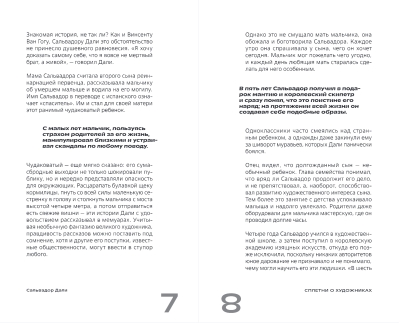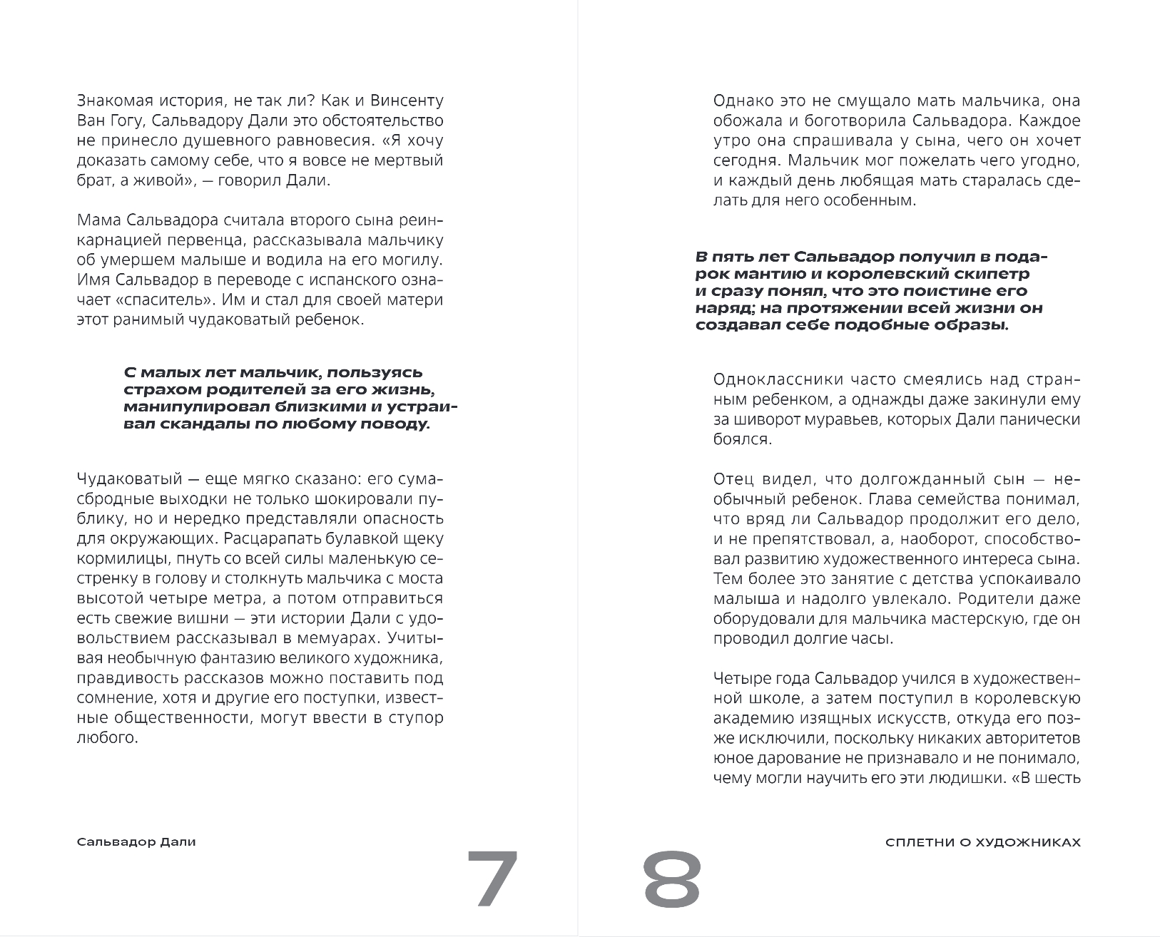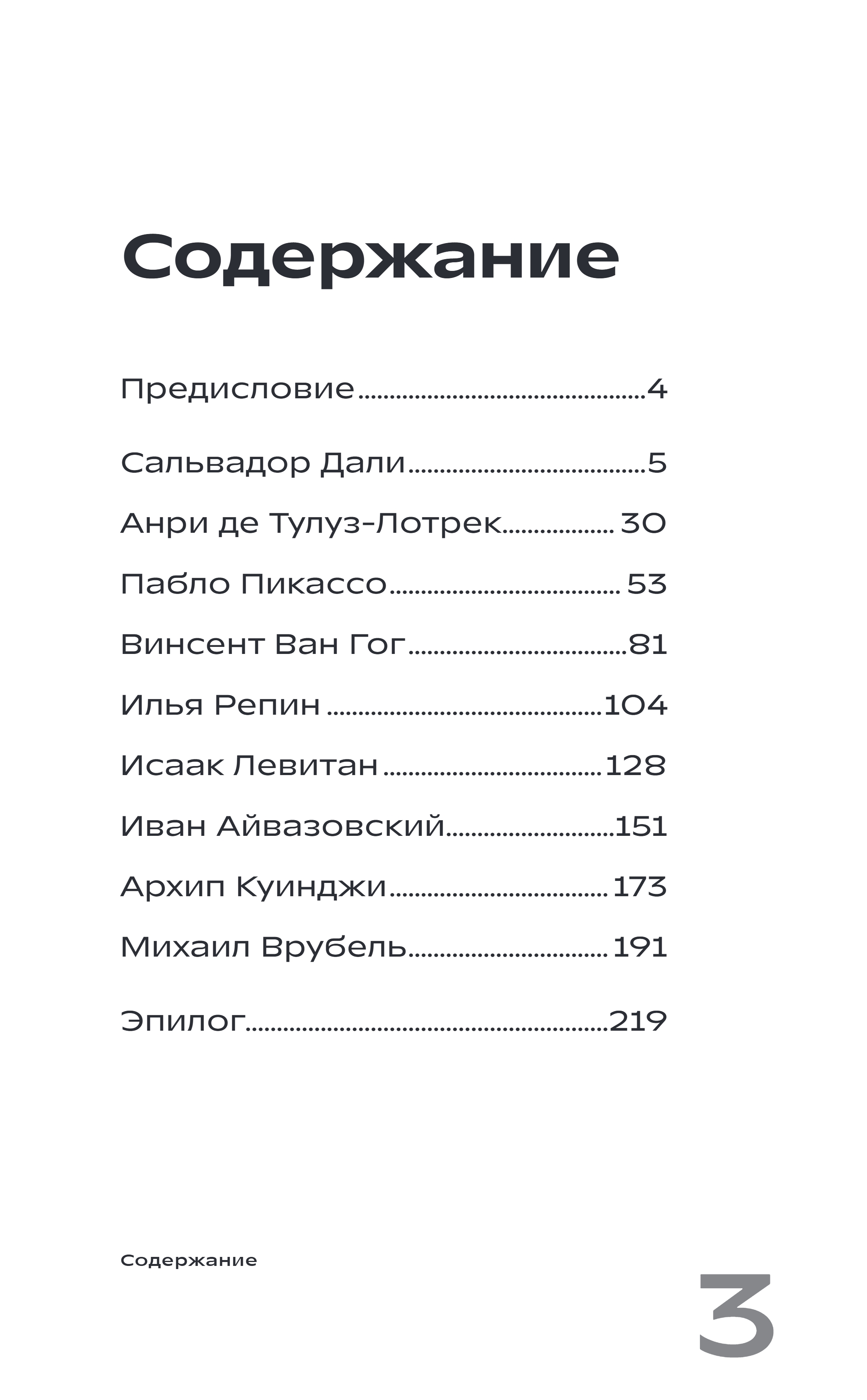 Вы познакомитесь с великим и ужасным Пабло Пикассо — величайшим новатором, ставшим студентом Академии художеств в 13 лет… и кошмаром для своих близких. Проследите за тернистым путем Винсента Ван Гога, который начал рисовать лишь в 27 лет, и узнаете, какая зловещая нить связывает его детство с детством Сальвадора Дали. Откроете темные и светлые стороны русских мастеров: благотворителя и домашнего тирана Ивана Айвазовского, идеалиста Архипа Куинджи, менявшего мир своей добротой, загадочного Михаила Врубеля, всю жизнь боровшегося со своим Демоном.