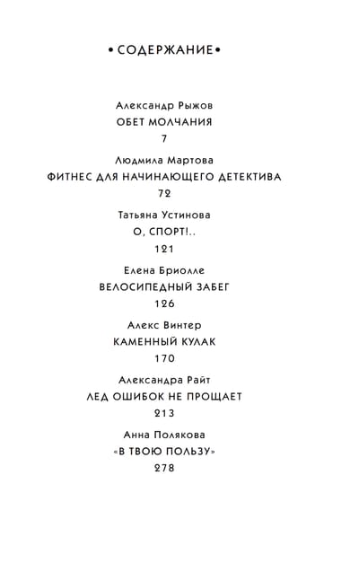 В сборник «Спортивный детектив» вошли рассказы популярных отечественных авторов: Татьяны Устиновой, Анны Поляковой, Людмилы Мартовой — и других мастеров жанра, которые виртуозно переплетают остросюжетную интригу и спортивные достижения. Вы сможете пережить моменты побед и поражений, парадоксальные загадки и опасные ситуации вместе с героями, которые не остановятся ни перед чем, чтобы докопаться до истины.