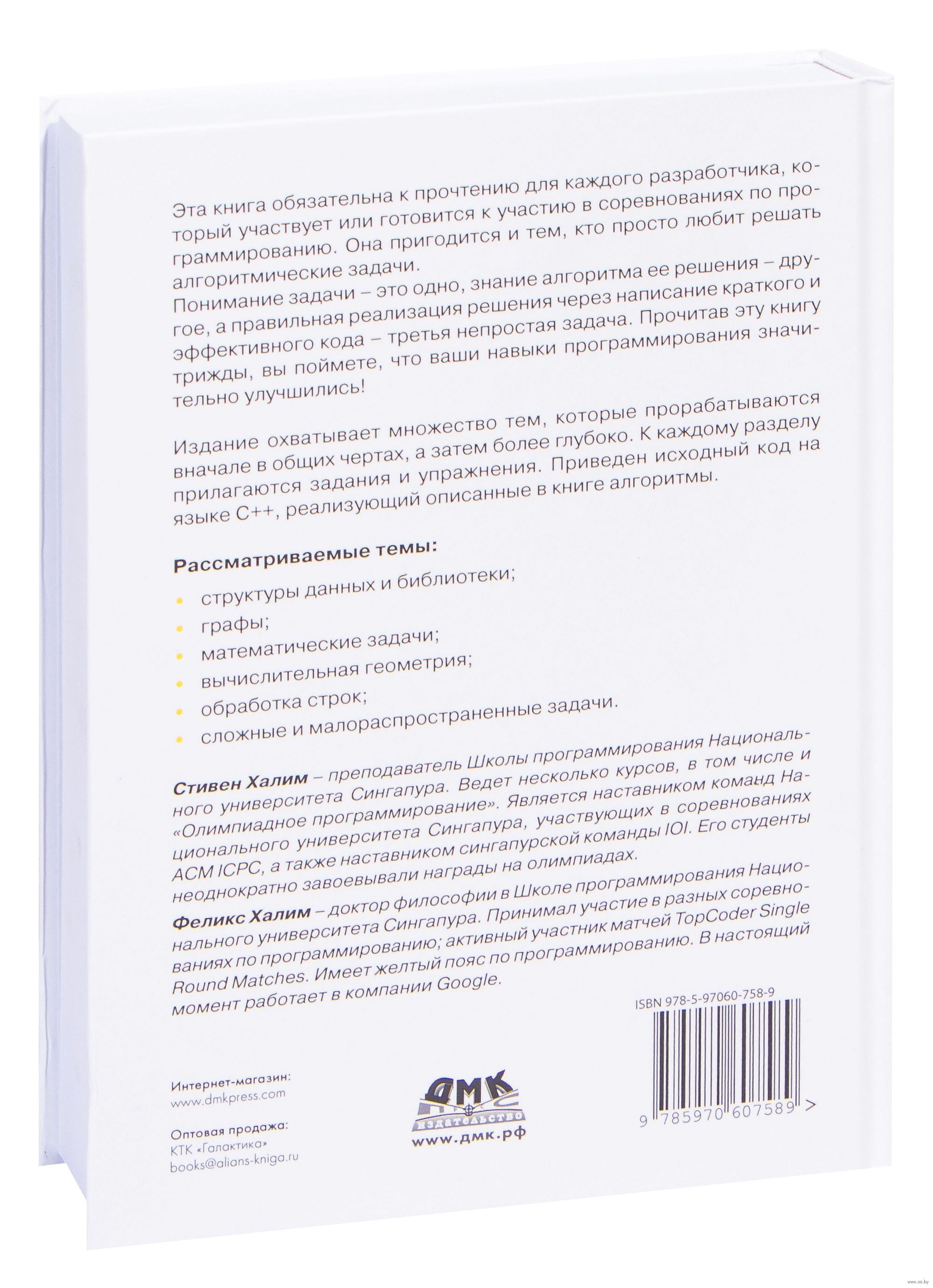 Эта книга обязательна к прочтению для каждого программиста, который участвует или готовится к участию в соревнованиях по программированию. Она пригодится и тем, кто просто любит решать задачи по информатике и программированию. Изучение материала книги позволит читателям сделать шаг вперед от обычного программиста до одного из лучших.