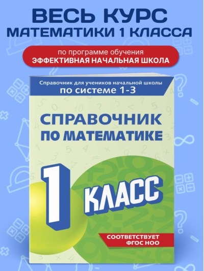 Справочник предназначен для младших школьников, обучающихся по ускоренной трёхлетней программе или по индивидуальному плану, а также для преподавателей, работающих по программе «Эффективная начальная школа». Главное требование к справочникам для учеников начальных классов — краткое и понятное изложение учебного материала. В данном пособии предельно доступно, в виде таблиц, схем, правил и примеров их применения, изложен весь курс математики за 1 класс по программе трёхлетнего обучения. Такая подача материала позволяет быстро найти нужную учебную информацию, основательно повторить и надёжно запомнить её. Современное и удобное в использовании пособие разработано в полном соответствии с требованиями ФГОС начального общего образования.