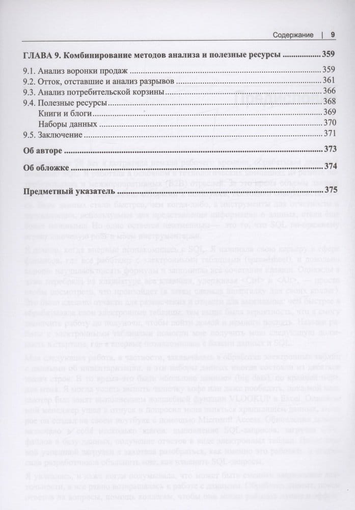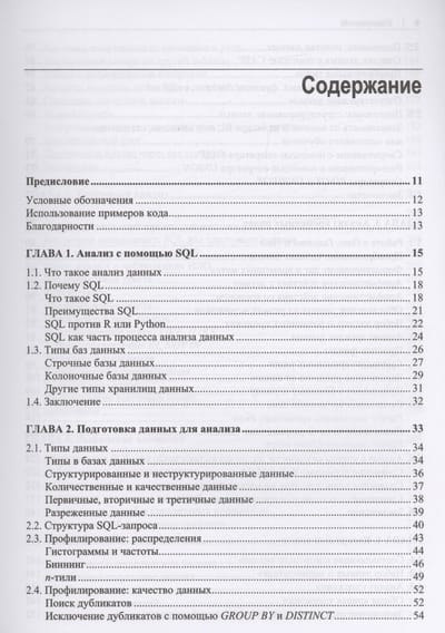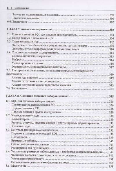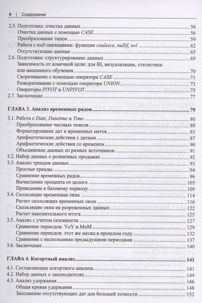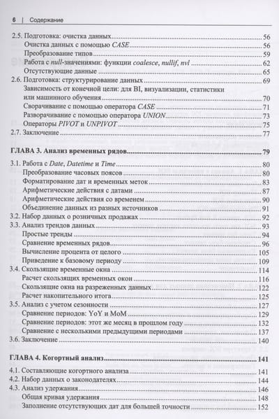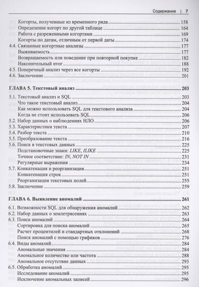 Рассказывается о возможностях SQL применительно к анализу данных. Сравниваются различные типы баз данных, описаны методы подготовки данных для анализа. Рассказано о типах данных, структуре SQL-запросов, профилировнии, структурировании и очистке данных. Описаны методы анализа временных рядов, трендов, приведены примеры анализа данных с учетом сезонности. Отдельные главы посвящены когортному анализу, текстовому анализу, выявлению и обработке аномалий, анализу результатов экспериментов и А/В-тестирования. Описано создание сложных наборов данных, комбинирование методов анализа. Приведены практические примеры анализа воронки продаж и потребительской корзины.