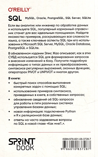 В обновленном издании Элис Жао описывает, как в этих СУБД используется SQL для формирования запросов и внесения изменений в базу. Получите подробную информацию о типах данных и их преобразованиях, синтаксисе регулярных выражений, оконных функциях, операторах PIVOT и UNPIVOT и многом другом.
