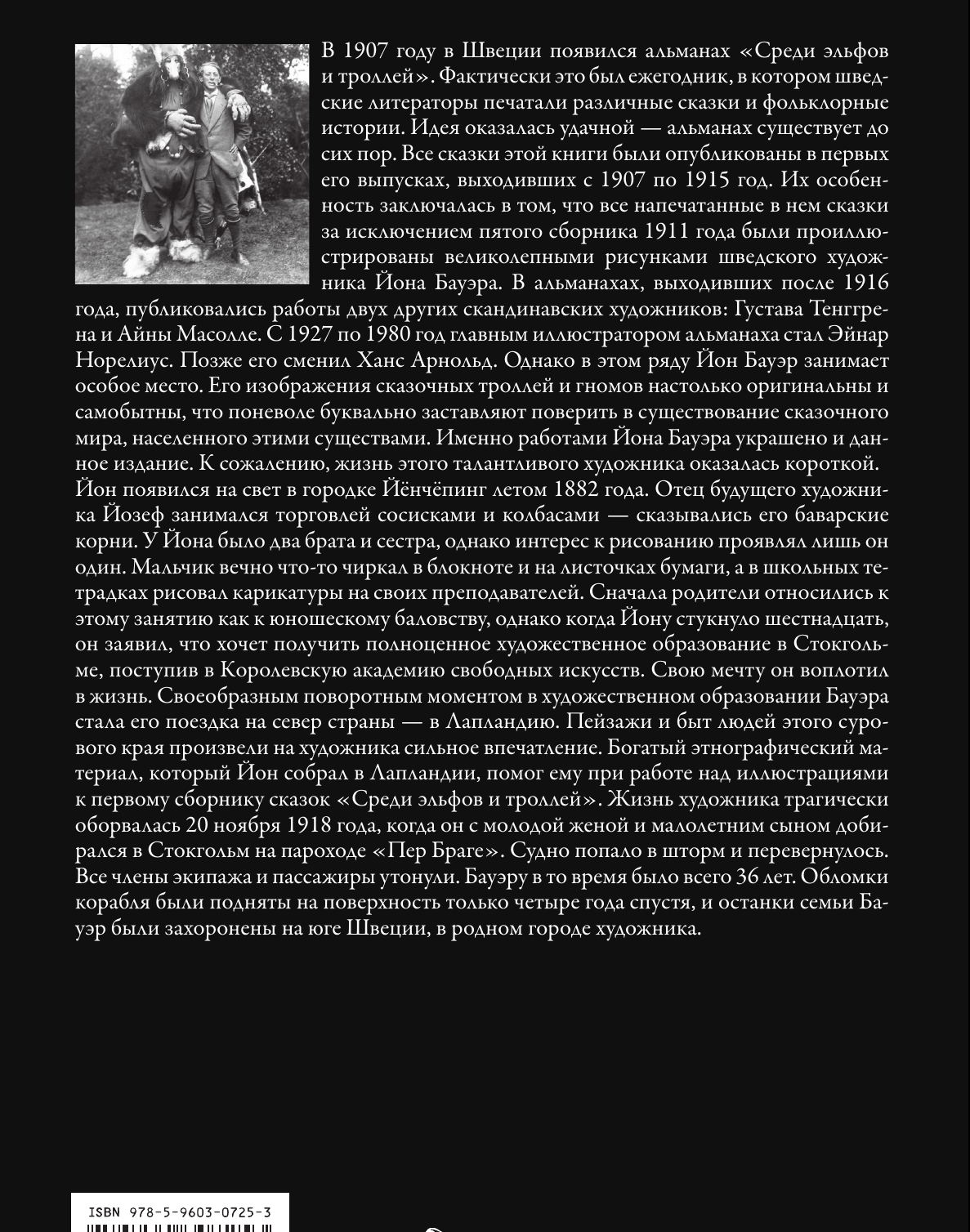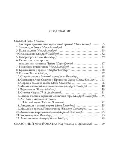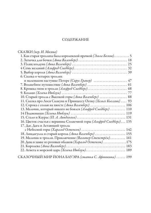 Сборник включает двадцать две сказки скандинавских писателей: Э. Бесков, А. Валенберг, А. Смедберга, С. Гранера, Х. Нюблум, Х. Кьеллин, П. Линдхольма, Х. Остенсона и В. Стенстрёма, опубликованных в первых выпусках шведского альманаха «Среди гномов и троллей» с 1907 по 1915 г. Все тексты даны в переводе И. Мосина. Завершает книгу статья С. Афонькина о творчестве талантливого шведского художника Йона Бауэра, рисунки которого украшают данное издание.