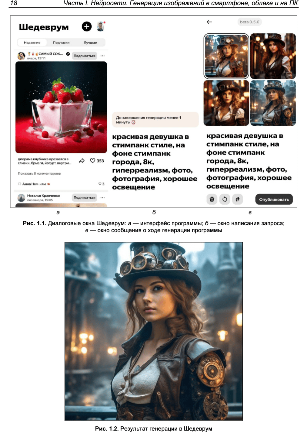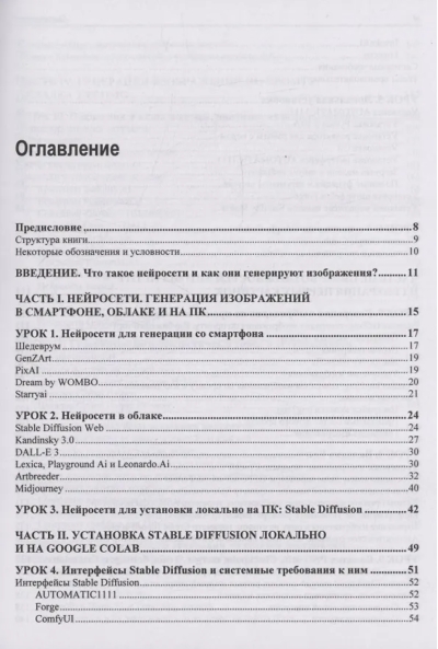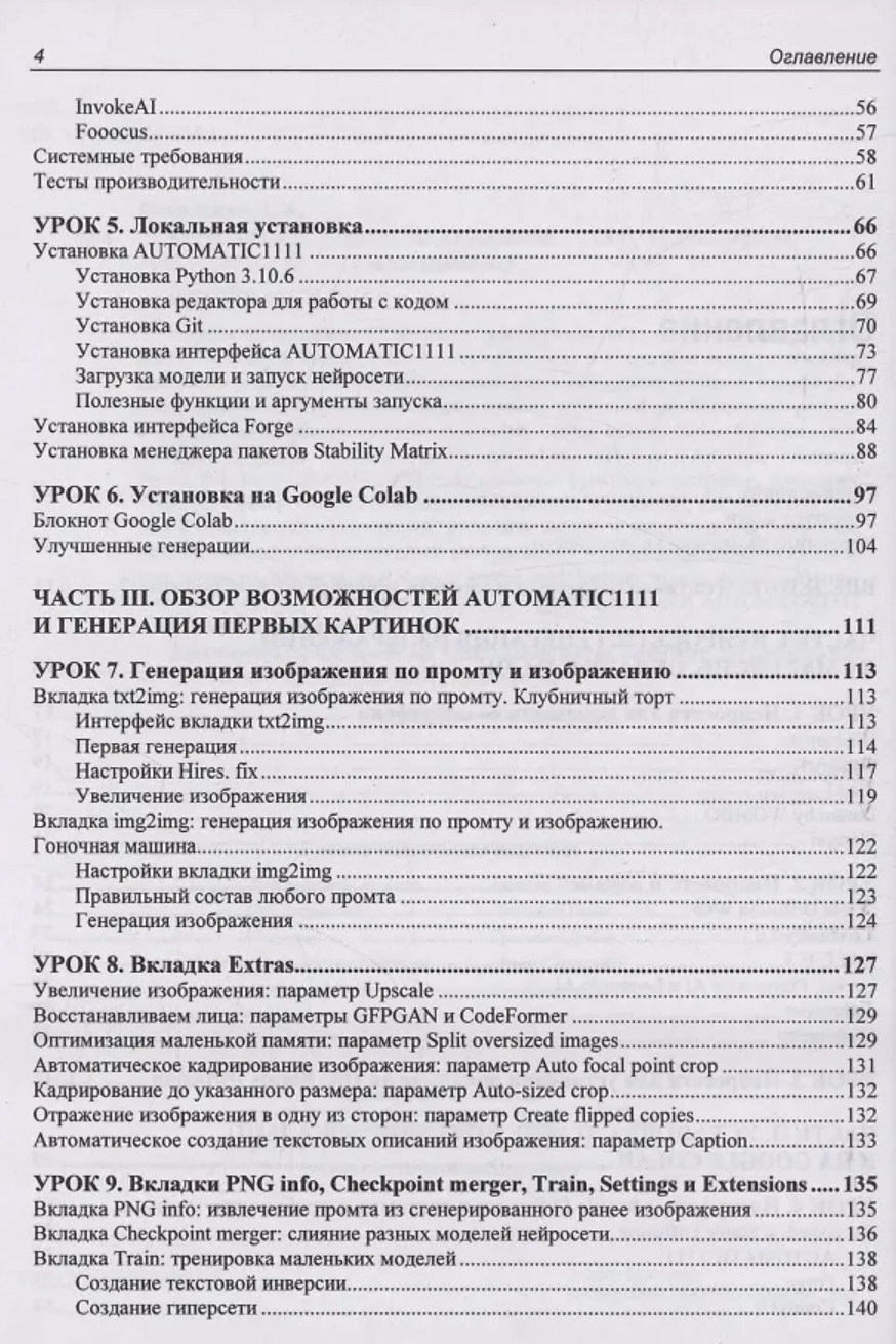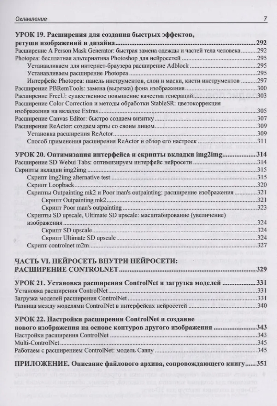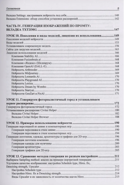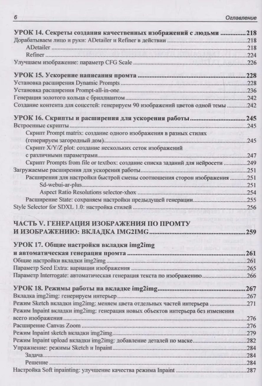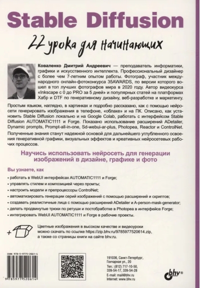 В книге представлено 22 проиллюстрированных урока по работе с нейросетью Stable Diffusion в интерфейсах AUTOMATIC1111 и Forge. Для лучшего усвоения материала разработаны сопровождающие книгу видеоуроки и сделан полный разбор всех моделей и препроцессоров ControlNet, доступный на электронном ресурсе Figma. Рассмотрены расширения ADetailer, Civitai Helper, State, A-person-mask-generator, Dynamic Prompts, Prompt All-in-One, SD-WebUI-AR-Plus, Photopea, FreeU, Reactor и ControlNet. Описаны основные функции и настройки, приведены примеры применения для генерации изображений. Рассказано, как управлять стилем и композицией через промты, настроить модели и препроцессоры ControlNet, автоматизировать генерации серий изображений с помощью расширений и скриптов, создавать реалистичные лица и другие изображения, использовать продвинутые трюки по ретуши и постобработке, интегрировать WebUI AUTOMATIC1111 и Forge в рабочие проекты.