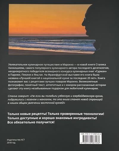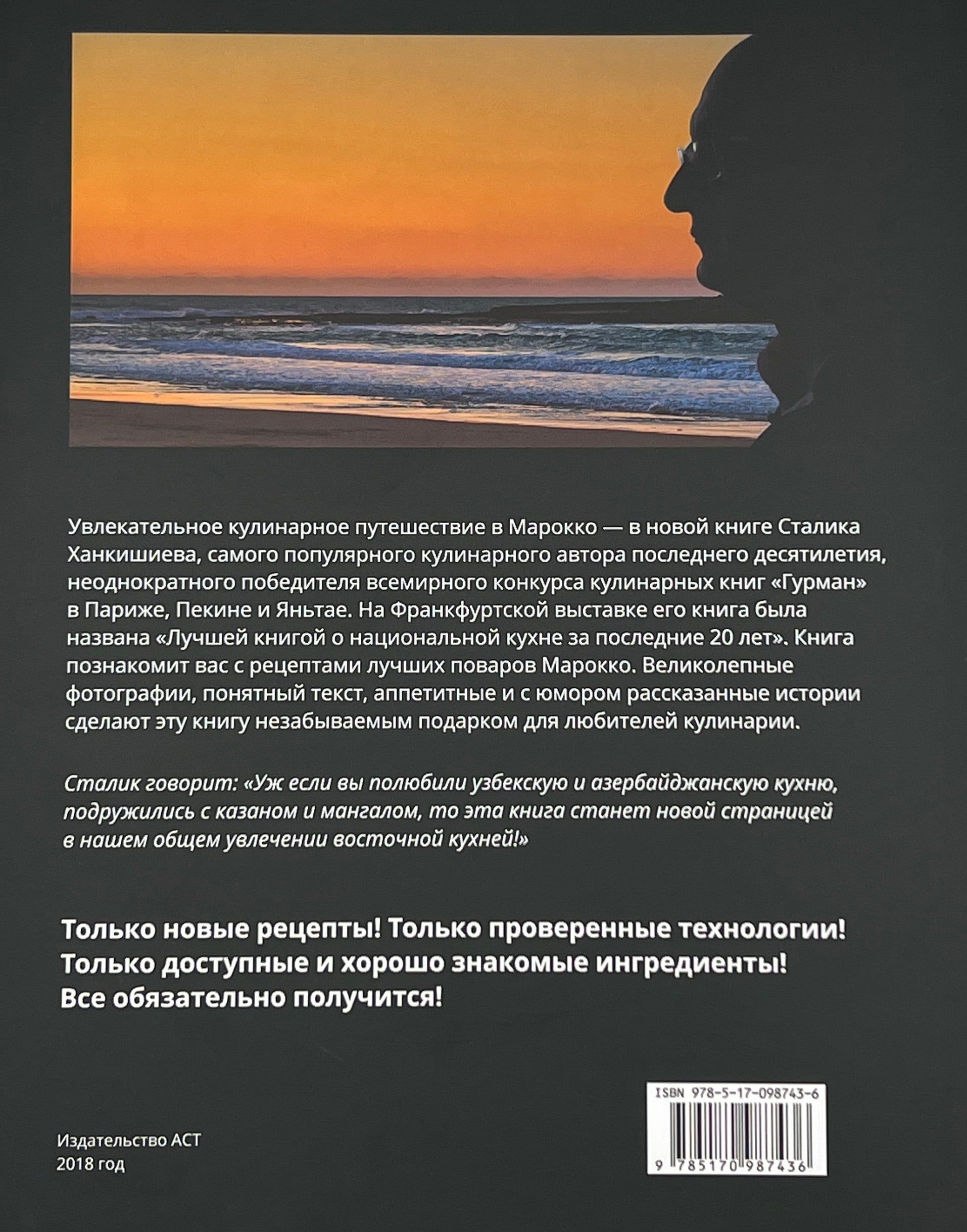 Увлекательное кулинарное путешествие в Марокко - в новой книге Сталика Ханкишиева - самого популярного кулинарного автора последнего десятилетия, неоднократного победителя всемирного конкурса кулинарных книг «‎ГУРМАН»‎ в Париже, Пекине и Яньтае, чья книга на Франкфуртской выставке была названа «‎Лучшей книгой о национальной кухне за последние 20 лет»‎.