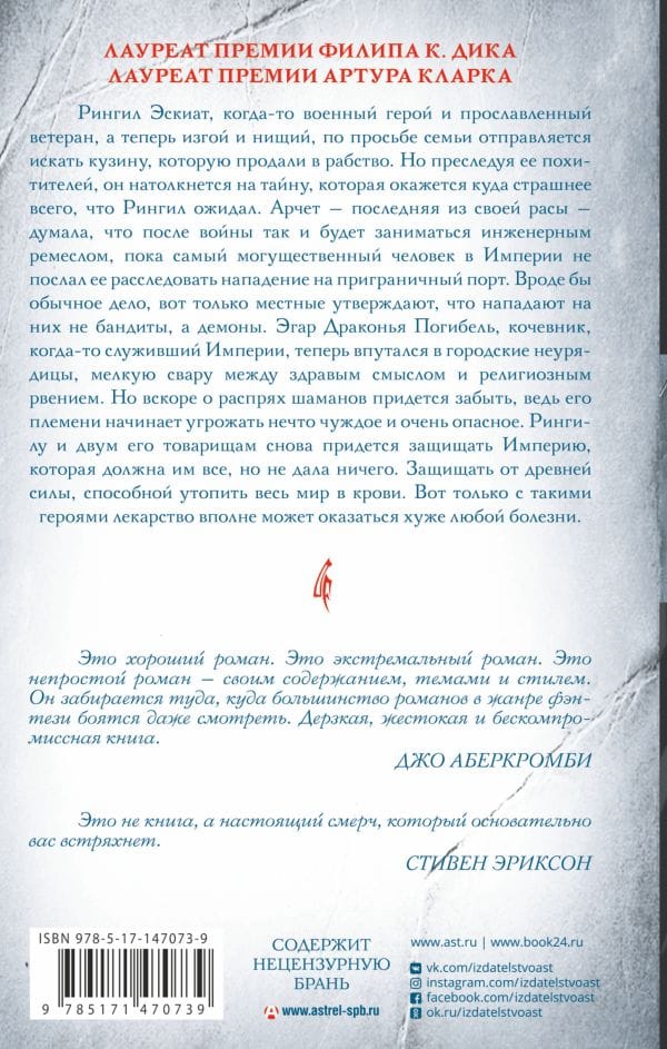 Рингил Эскиат, когда‑то военный герой и прославленный ветеран, а теперь изгой и нищий, по просьбе семьи отправляется искать кузину, которую продали в рабство. Но преследуя ее похитителей, он натолкнется на тайну, которая окажется куда страшнее всего, что Рингил ожидал. Арчет — последняя из своей расы — думала, что после войны так и будет заниматься инженерным ремеслом, пока самый могущественный человек в Империи не послал ее расследовать нападение на приграничный порт. Вроде бы обычное дело, вот только местные утверждают, что нападают на них не бандиты, а демоны. Эгар Драконья Погибель, кочевник, когда‑то служивший Империи, теперь впутался в городские неурядицы, мелкую свару между здравым смыслом и религиозным рвением. Но вскоре о распрях шаманов придется забыть, ведь его племени начинает угрожать нечто чуждое и очень опасное. Рингилу и двум его товарищам снова придется защищать Империю, которая должна им все, но не дала ничего. Защищать от древней силы, способной утопить весь мир в крови. Вот только с такими героями лекарство вполне может оказаться хуже любой болезни.