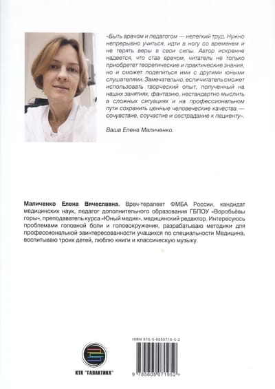 У вас в руках первая книга Маличенко Елены, врача-терапевта, кандидата медицинских наук, педагога дополнительного образования ГБПОУ «Воробьёвы горы». Данная книга предназначена читателям, которые хотели бы связать свою профессию с медициной. В книге 24 занятия и приложения к ним. Автор рекомендует изучать материал последовательно и выполнять задание в соответствующем приложении. Каждую главу сопровождают иллюстрации, пояснения, творческие задания (кроссворд, поделка, раскраска) и практические занятия (наложение повязки, оформление анатомической схемы, эксперимент). В книге представлены фотографии с занятий на курсе «Юный медик», поделки и рисунки учеников автора. Книга рекомендована для самостоятельного изучения детьми школьного возраста и будет полезна в качестве дополнительного материала к курсу биологии в средних классах.