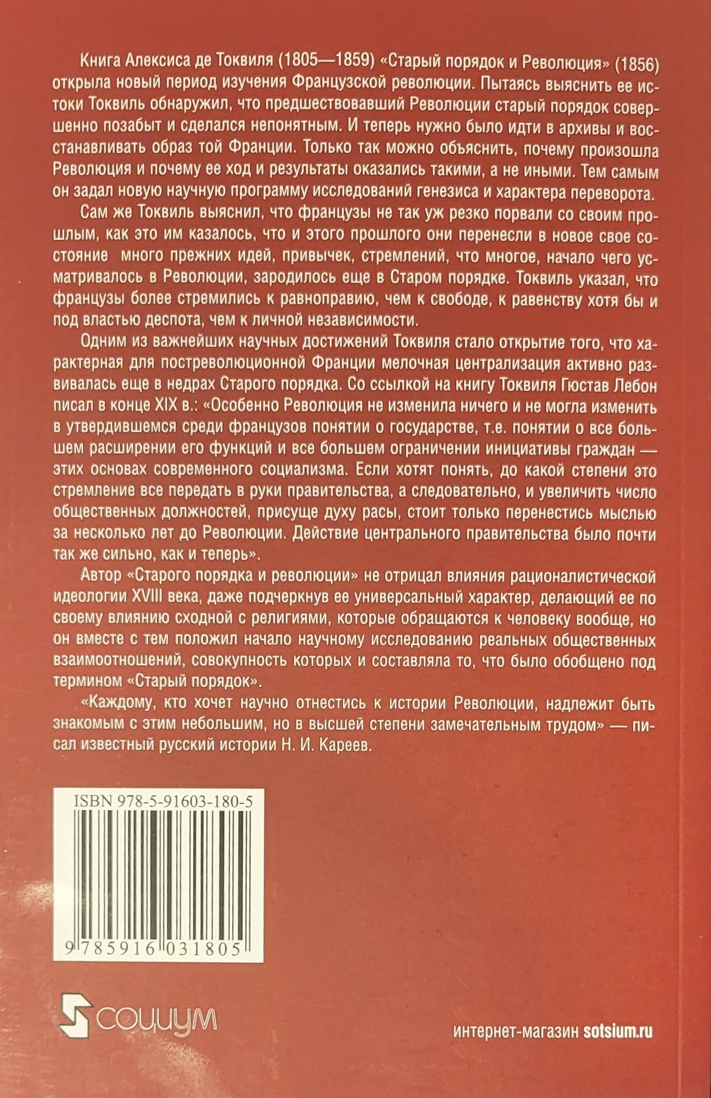 Книга Алексиса де Токвиля «Старый порядок и Революция» (1856) открыла новый период изучения Французской революции. Пытаясь выяснить ее истоки Токвиль обнаружил, что предшествовавший Революции старый порядок совершенно позабыт и сделался непонятным. И теперь нужно было идти в архивы и восстанавливать образ той Франции. Только так можно объяснить, почему произошла Революция и почему ее ход и результаты оказались такими, а не иными. Тем самым он задал новую научную программу исследований генезиса и характера переворота. Сам же Токвиль выяснил, что французы не так уж резко порвали со своим прошлым, как это им казалось, что и этого прошлого они перенесли в новое свое состояние много прежних идей, привычек, стремлений, что многое, начало чего усматривалось в Революции, зародилось еще в Старом порядке. Токвиль указал, что французы более стремились к равноправию, чем к свободе, к равенству хотя бы и под властью деспота, чем к личной независимости. В остальной Европе были, по сути, такие же порядки, как и в дореволюционной Франции, что и везде эти порядки падали, и что во Франции их ликвидация началась лишь раньше, чем в других местах.