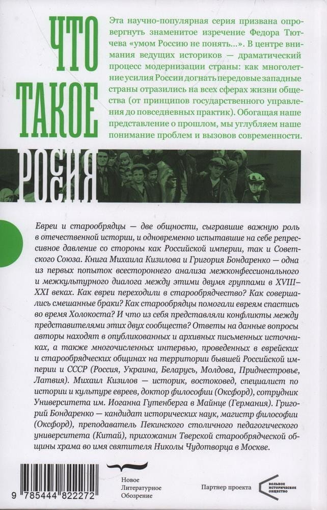 Евреи и старообрядцы — две общности, сыгравшие важную роль в отечественной истории, и одновременно испытавшие на себе репрессивное давление со стороны как Российской империи, так и Советского Союза. Книга Михаила Кизилова и Григория Бондаренко — одна из первых попыток всестороннего анализа межконфессионального и межкультурного диалога между этими двумя группами в XVIII–XXI веках. Как евреи переходили в старообрядчество? Как совершались смешанные браки? Как старообрядцы помогали евреям спастись во время Холокоста? И что из себя представляли конфликты между представителями этих двух сообществ? Ответы на данные вопросы авторы находят в опубликованных и архивных письменных источниках, а также многочисленных интервью, проведенных в еврейских и старообрядческих общинах на территории бывшей Российской империи и СССР (Россия, Украина, Беларусь, Молдова, Приднестровье, Латвия). Михаил Кизилов — историк, востоковед, специалист по истории и культуре евреев, доктор философии (Оксфорд), сотрудник Университета им. Иоганна Гутенберга в Майнце (Германия). Григорий Бондаренко — кандидат исторических наук, магистр философии (Оксфорд), преподаватель Пекинского столичного педагогического университета (Китай), прихожанин Тверской старообрядческой общины храма во имя святителя Николы Чудотворца в Москве.