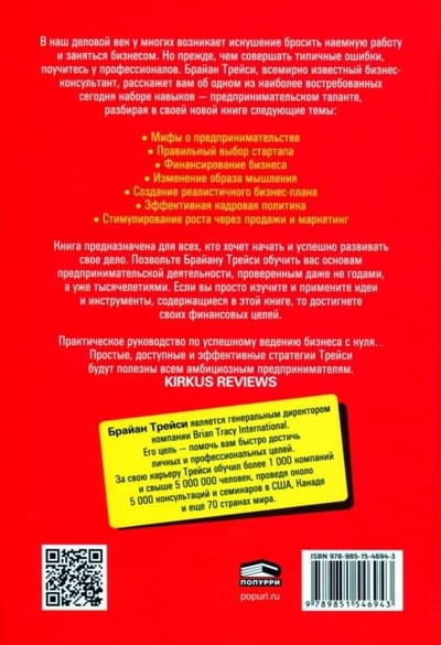 В наш деловой век у многих возникает искушение бросить наемную работу и заняться бизнесом. Но прежде чем совершать типичные ошибки, поучитесь у профессионалов. Брайан Трейси, всемирно известный бизнес-консультант, расскажет вам об одном из наиболее востребованных сегодня наборе навыков - предпринимательском таланте. Книга предназначена для всех, кто хочет начать и успешно развивать свое дело. Позвольте Брайану Трейси обучить вас основам предпринимательской деятельности, проверенным даже не годами, а уже тысячелетиями. Если вы просто изучите и примените идеи и инструменты, содержащиеся в этой книге, то достигнете своих финансовых целей.