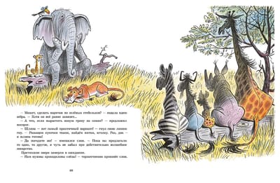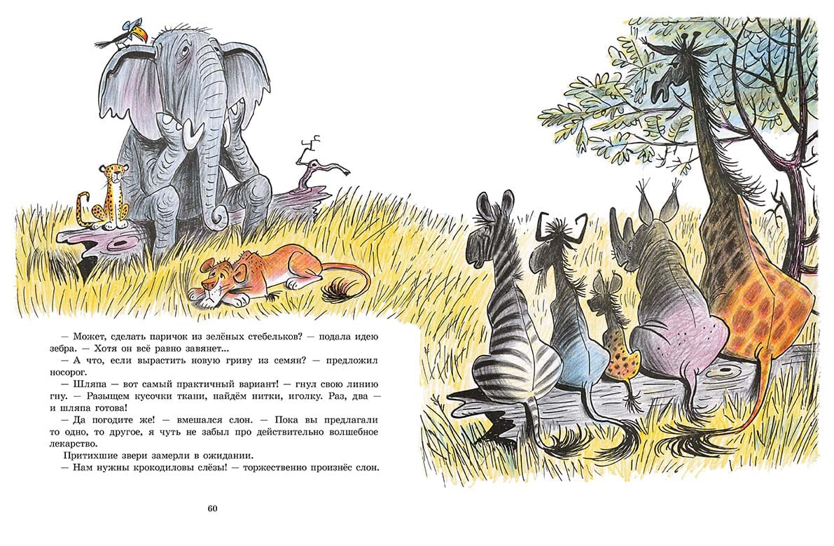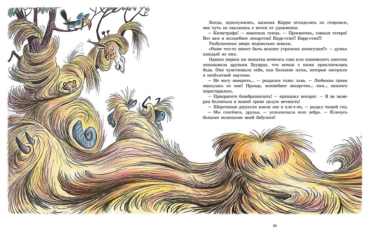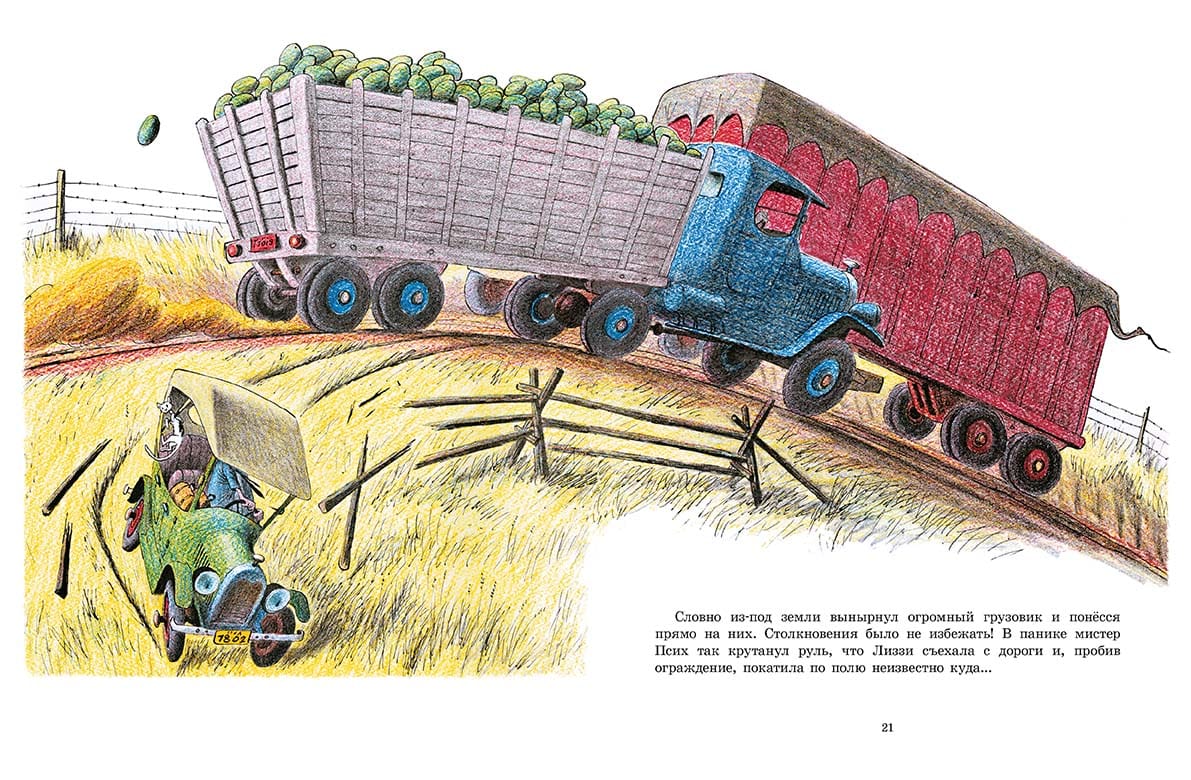 В сборник известного американского писателя, сценариста и художника-мультипликатора студии Уолта Диснея Билла Пита (1915-2002) вошли две сказочные истории: «Старушка Лиззи и Мяо-Мурси» и «История, от которой волосы встают дыбом». Старушка Лиззи — некогда модная и знаменитая машина уныло ржавела на свалке. Ее ждала та же участь, что и все старые автомобили: их разбирают и распродают по частям. Однако Лиззи повезло больше: ее мотор оказался живчиком, и хозяин свалки продал Лиззи верзиле с двумя чемоданами и, как выяснилось позднее, любителю быстрой езды. В нагрузку сумасшедшему лихачу досталась кошка по имени Мяо-Мурси. Увидев, что ее дом на колесах уезжает, Мяо-Мурси запрыгнула в окно и улеглась на заднем сиденье. Так началось путешествие, которое вполне могло бы стать для наших героев последним, если бы не крепость духа старой машины и не здравомыслие тощей кошки. Лев Эдуард гордился своей роскошной гривой и на других поглядывал свысока. Но судьба любит посмеяться над зазнайками, и всего одна маленькая злая искра превратила предмет его гордости в пылающий куст. Вместе с гривой царь зверей утратил и всю свою заносчивость. Теперь он хотел только одного — провалиться сквозь землю. Увы, спрятаться не получилось, беднягу заметила старая сплетница ворона Карри и вскоре постыдную тайну лысого льва обсуждала уже вся саванна. Вопреки опасениям Эдуарда, вид его голой, как коленка, головы вызвал у зверей искреннее сочувствие. Все наперебой предлагали свои варианты решения столь деликатной проблемы, но лишь слон смог от слов перейти к делу. В одиночку он отправился на болото за волшебным лекарством — крокодиловыми слезами.