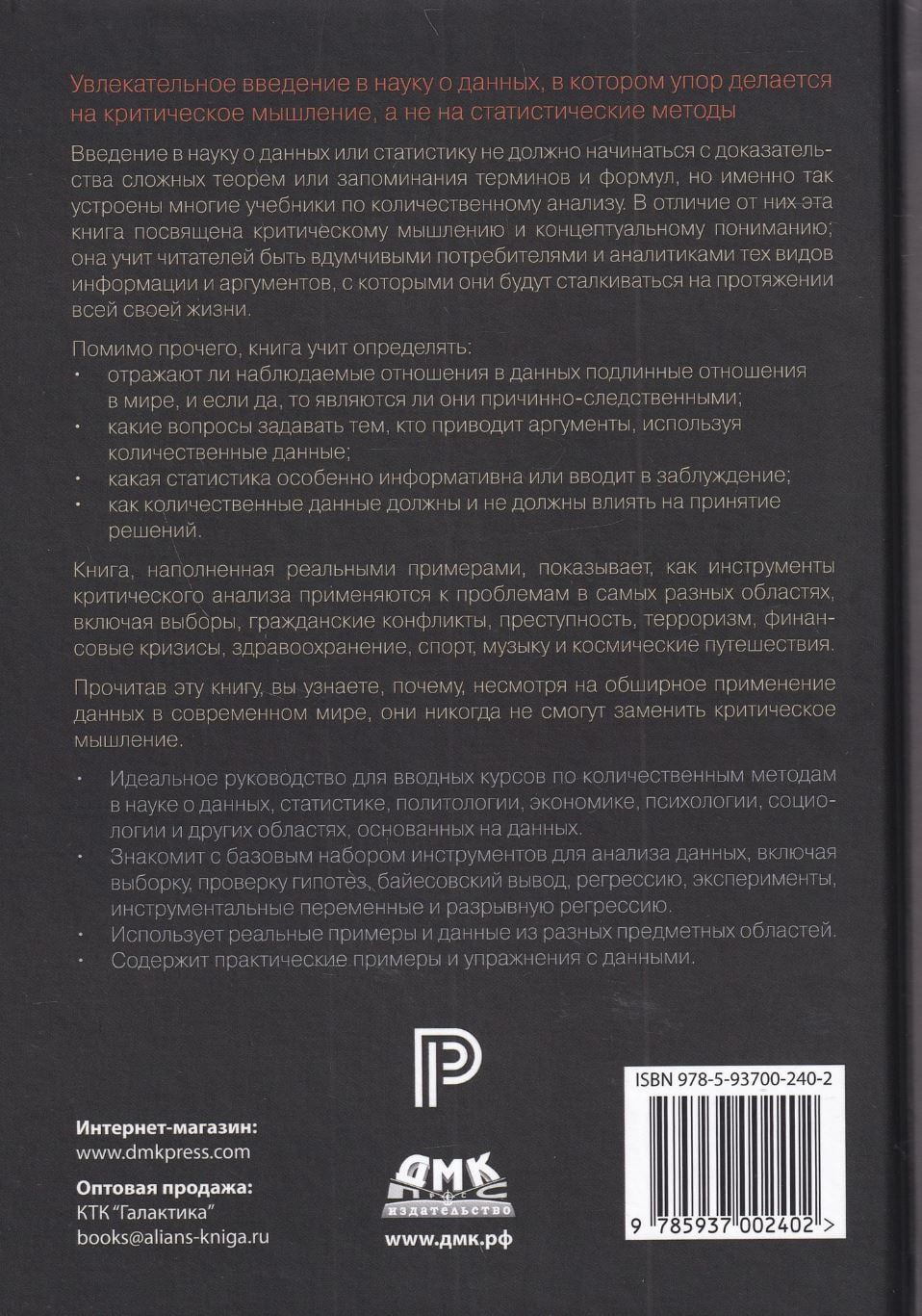 Введение в науку о данных или статистику не должно начинаться с доказательства сложных теорем или запоминания терминов и формул, но именно так устроены многие учебники по количественному анализу. В отличие от них эта книга посвящена критическому мышлению и концептуальному пониманию; она учит читателей быть вдумчивыми потребителями и аналитиками тех видов информации и аргументов, с которыми они будут сталкиваться на протяжении всей своей жизни.