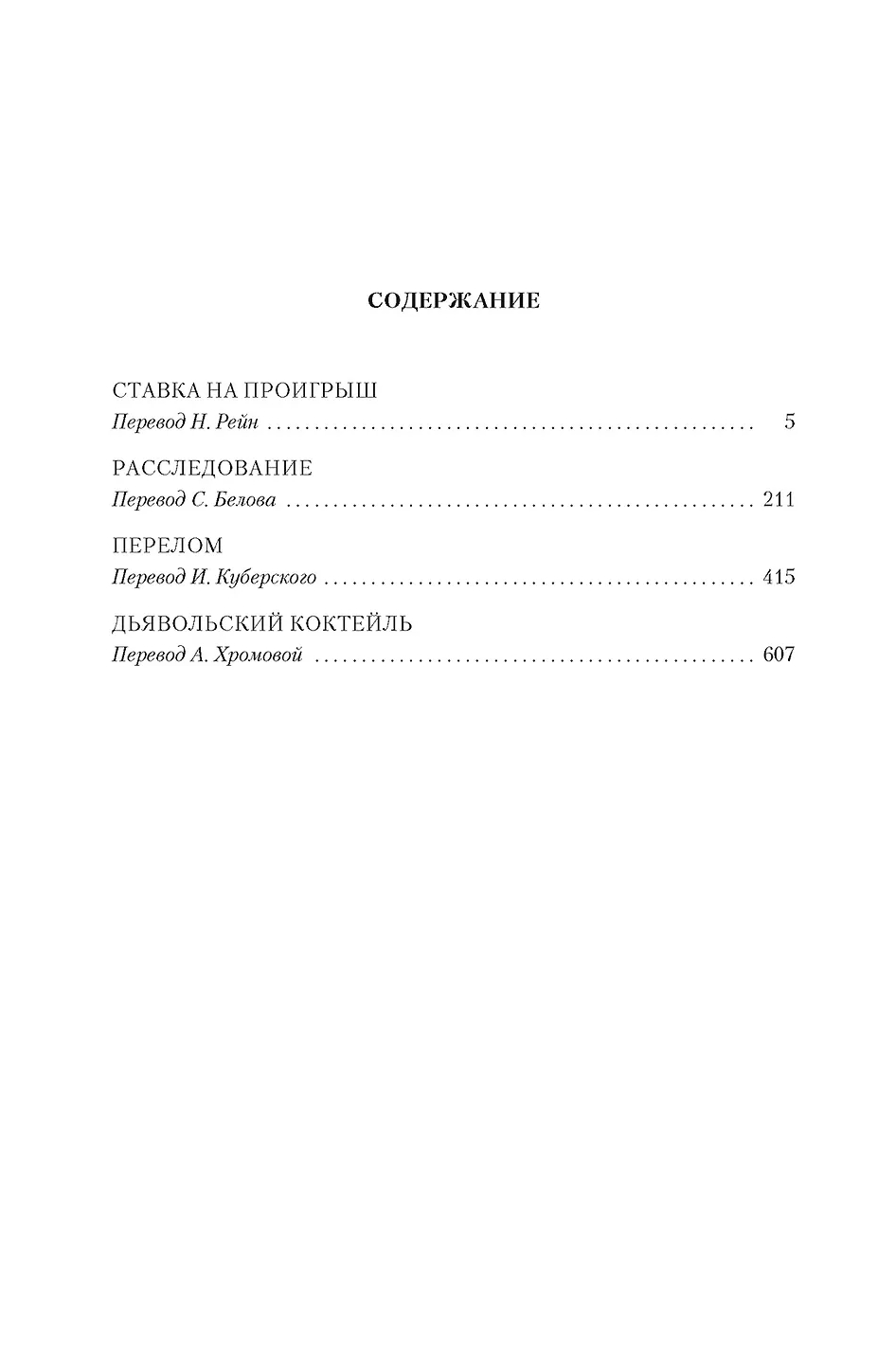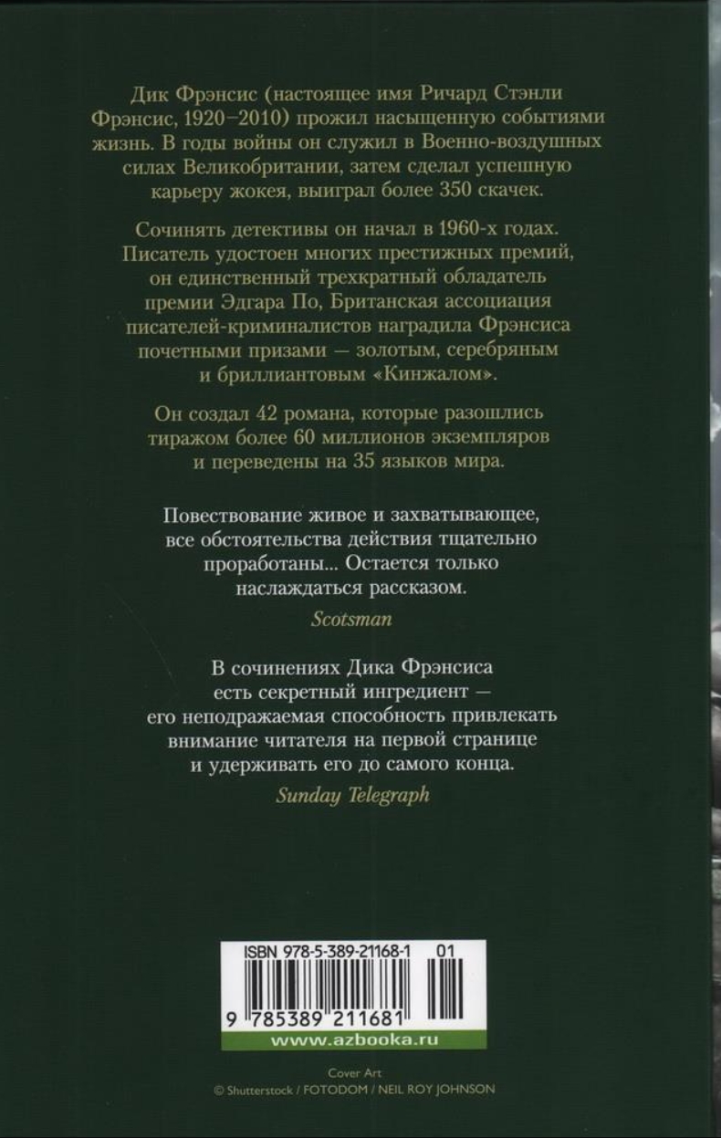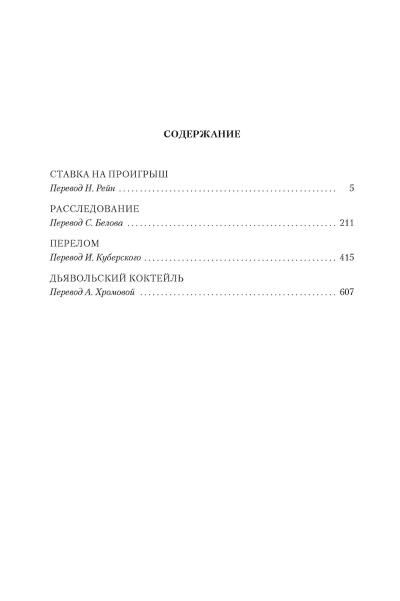 Дик Фрэнсис (1920–2010) — один из самых именитых английских авторов, писавших в жанре детектива. За свою жизнь он создал более 30 бестселлеров, получивших международное признание. Его романы посвящены преимущественно миру скачек — Фрэнсис знал его не понаслышке, ведь он родился в семье жокея и сам был знаменитым жокеем. Этот мир полон азарта, здесь кипят нешуточные страсти вокруг великолепных лошадей и крупных ставок в тотализаторах, здесь есть чем поживиться мошенникам. В сборник вошли увлекательные романы, созданные на рубеже 1960–1970-х годов: «Ставка на проигрыш», «Расследование», «Перелом» и «Дьявольский коктейль».