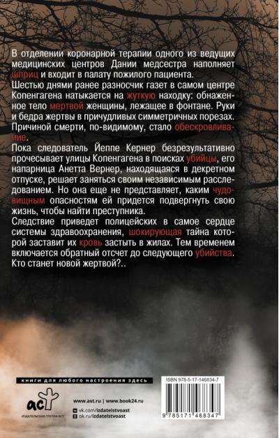 Шестью днями ранее разносчик газет в самом центре Копенгагена натыкается на жуткую находку: обнаженное тело мертвой женщины, лежащее в фонтане. Руки и бедра жертвы в причудливых симметричных порезах. Причиной смерти, по-видимому, стало обескровливание. Пока следователь Йеппе Кернер безрезультативно прочесывает улицы Копенгагена в поисках убийцы, его напарница Анетта Вернер, находящаяся в декретном отпуске, решает заняться своим независимым расследованием. Но она еще не представляет, каким чудовищным опасностям ей придется подвергнуть свою жизнь, чтобы найти преступника. Следствие приведет полицейских в самое сердце системы здравоохранения, шокирующая тайна которой заставит их кровь застыть в жилах. Тем временем включается обратный отсчет до следующего убийства. Кто станет новой жертвой?..