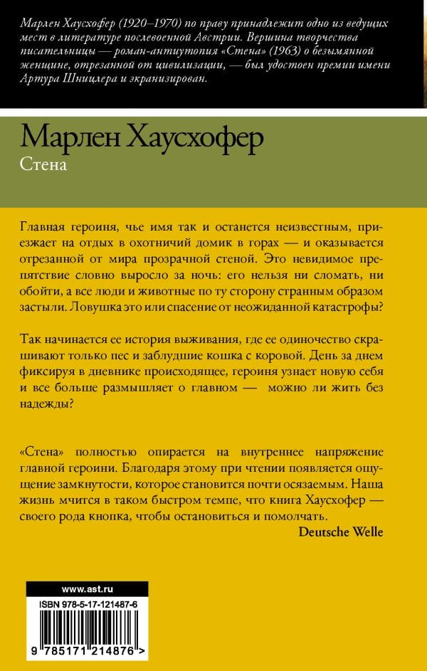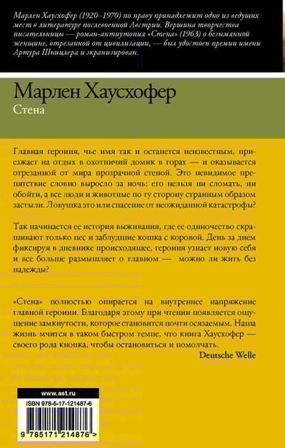 Главная героиня, чье имя так и останется неизвестным, приезжает на отдых в охотничий домик в горах - и оказывается отрезанной от мира прозрачной стеной. Это невидимое препятствие словно выросло за ночь: его нельзя ни сломать, ни обойти, а все люди и животные по ту сторону странным образом застыли. Это ловушка или спасение от неожиданной катастрофы? Так начинается ее история выживания, где одиночество скрашивают только пес и заблудшие кошка с коровой. День за днем фиксируя в дневнике происходящее, героиня узнает новую себя и все больше размышляет о главном - можно ли жить без надежды?