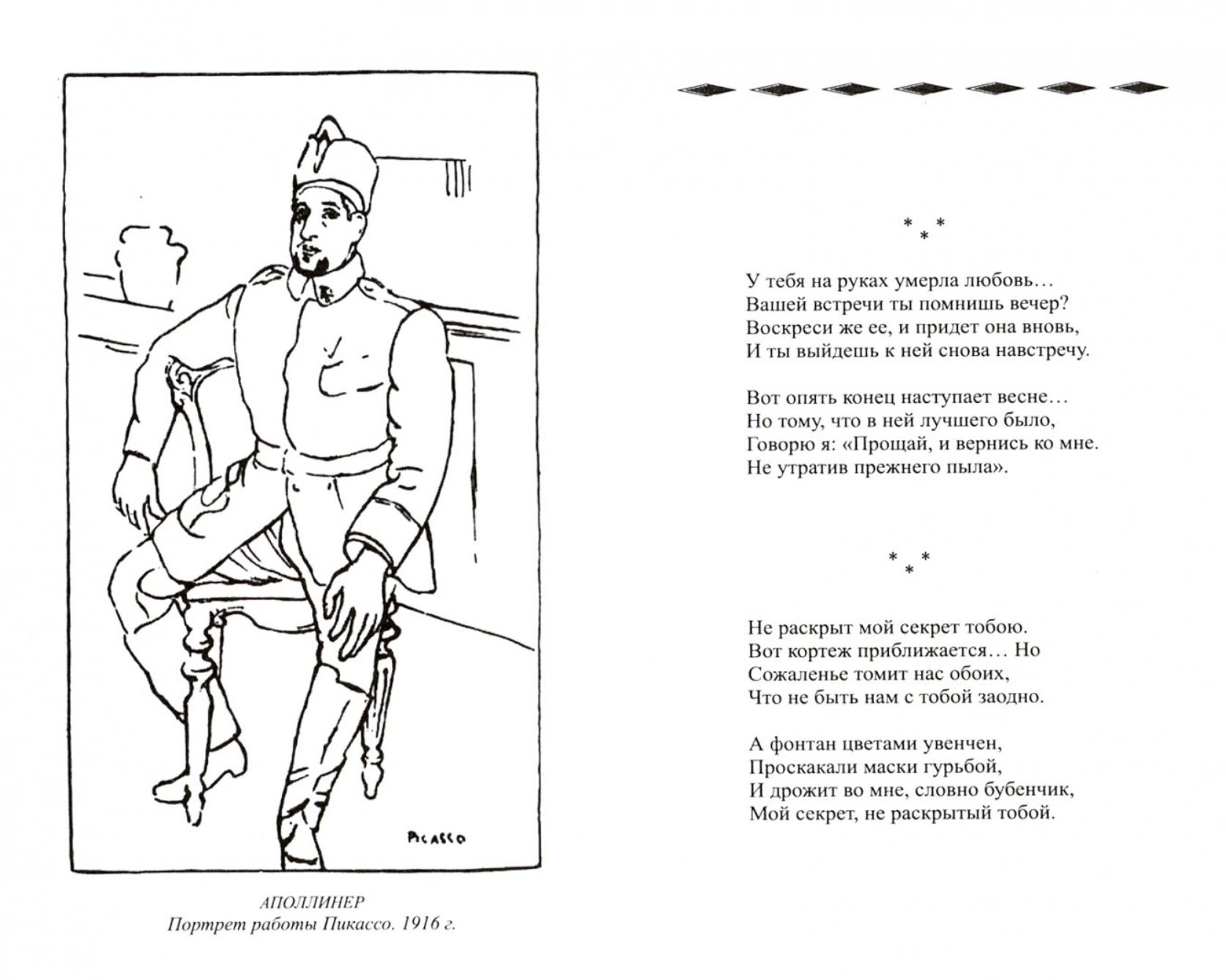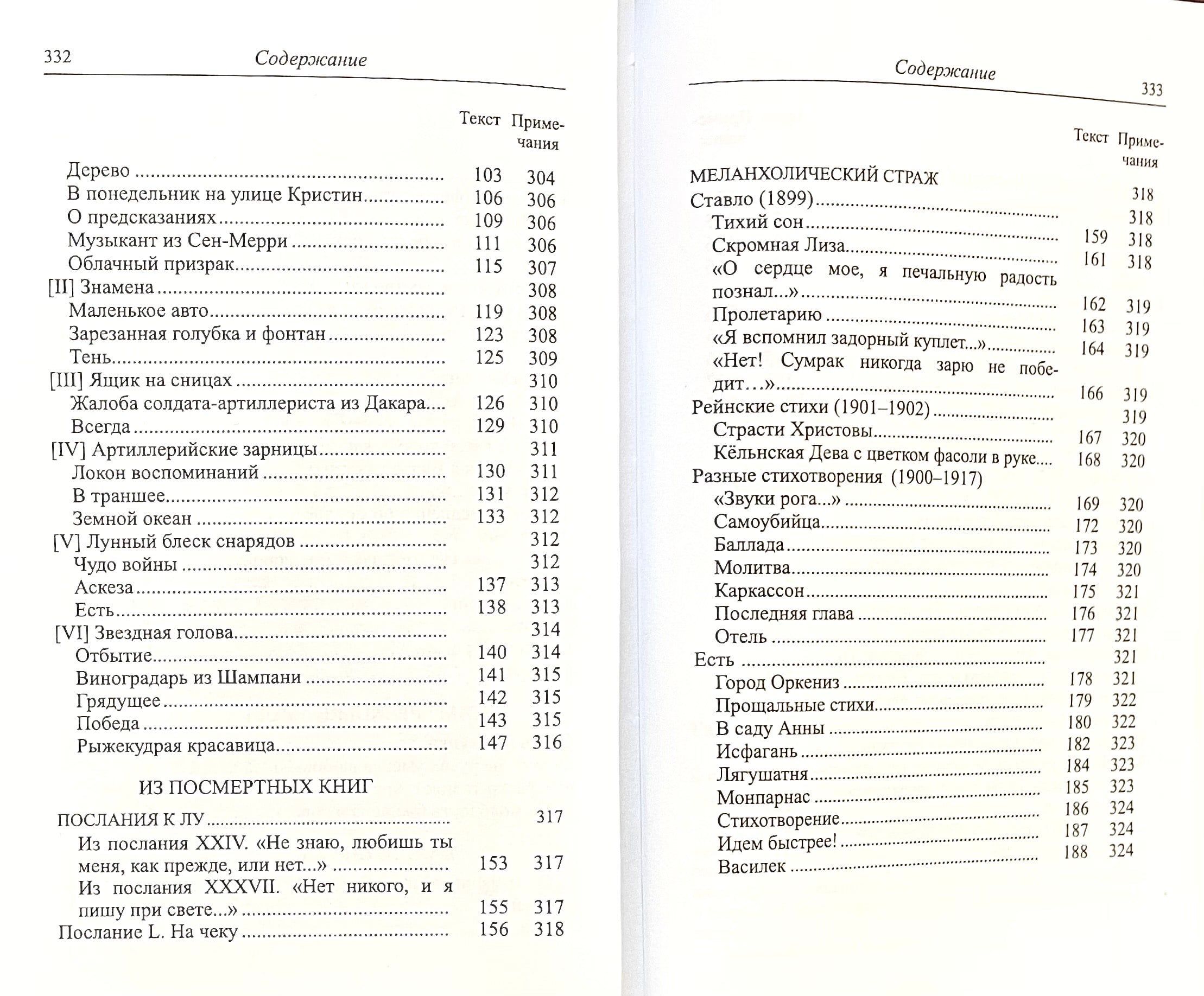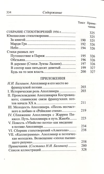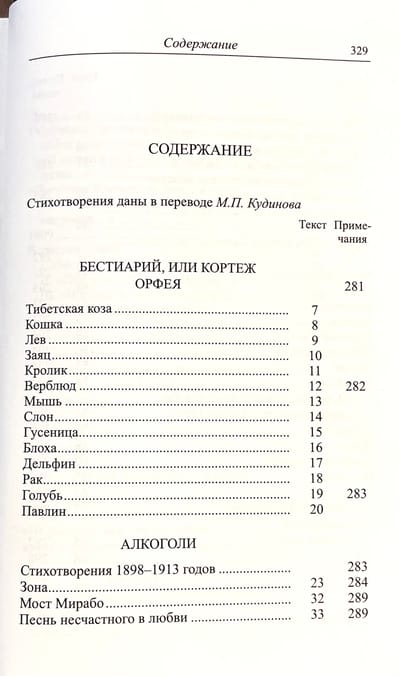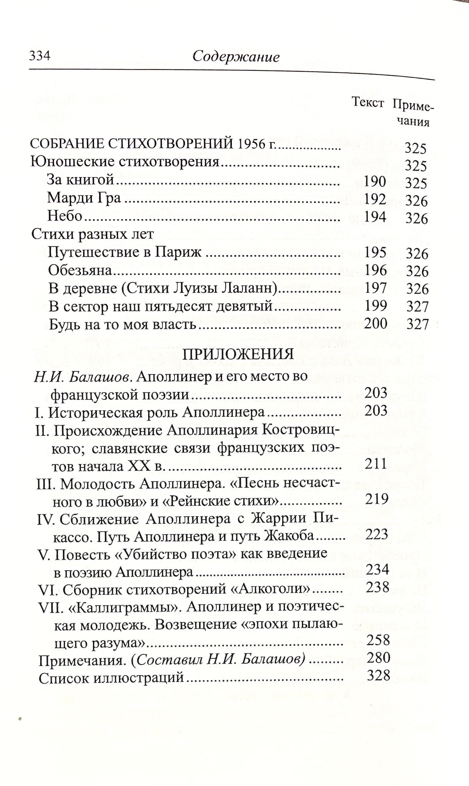 В книгу вошли избранные стихотворения из основных сборников Гийома Аполлинера: «Бестиарий, или Кортеж Орфея», «Алкоголи», «Каллиграммы» и др. Стихотворения сопровождаются иллюстрациями, комментариями и статьей Н. И. Балашова о жизни и творчестве Аполлинера, его влиянии на французскую и мировую поэзию.